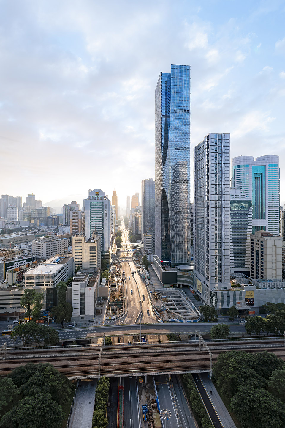 Shenzhen Zhaoxin Huijin Plaza is located at the prime intersection of Shennan Avenue and Jianshe Road, facing prominent landmarks such as Diwang Tower and KK100 in Luohu. It was essential to create a distinctive and impactful image to stand out among the surrounding structures.