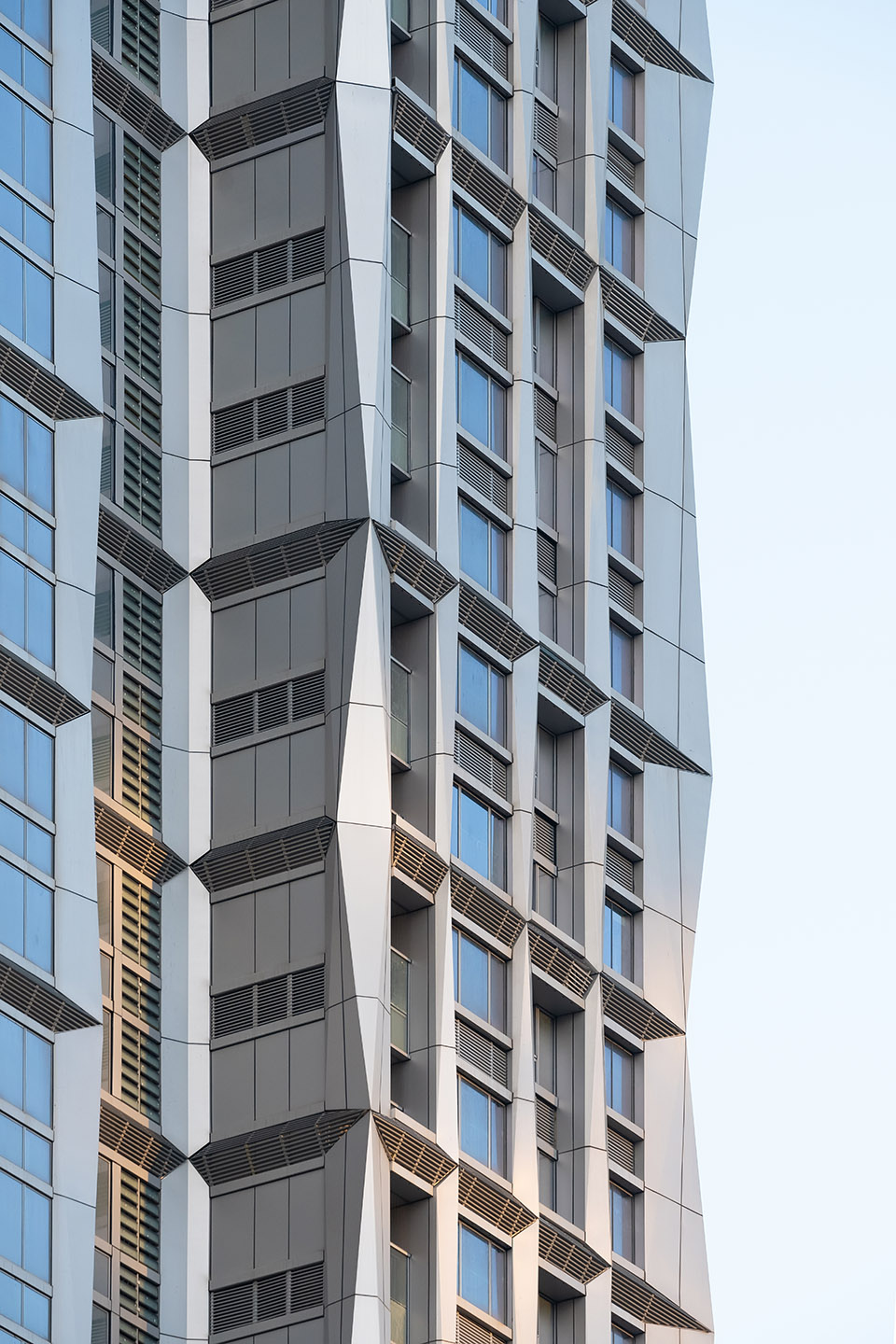 Inspired by sunlight filtering through the branches of a mangrove tree, the façade’s texture captures and reproduces the interplay of intertwining patterns and natural regularity. The texture transitions dynamically from the base to the top of the building, avoiding repetition. At the bottom, it begins as a sparse, orthogonal grid, gradually transforming into a dense, diamond-shaped texture at the Sky Lobby in the middle of the tower. From there, it shifts back to an orthogonal grid as it ascends toward the top. This gradual progression creates a dynamic connection that reflects the tower’s form, seamlessly linking the lower standard floors, the central Sky Lobby (with the largest planimetric profile), and the upper floors. The façade ultimately achieves a coherent design vocabulary while allowing sunlight to interact with its rich texture, casting a variety of captivating light and shadow effects inside the building throughout the day.