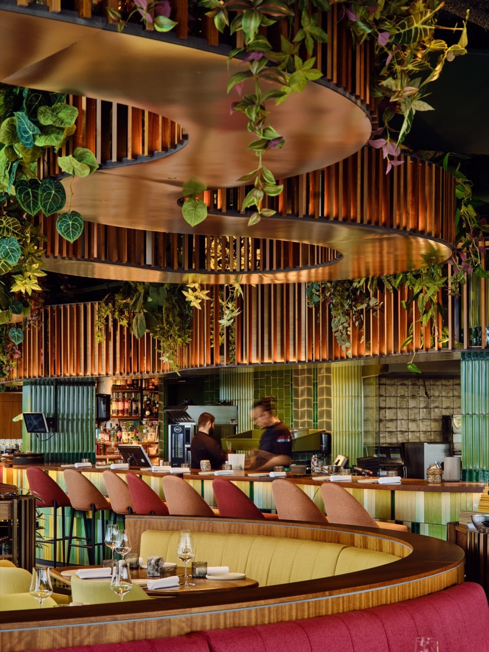 在绿色背景的衬托下,设计团队结合了有机灵感的地板和丰富的植被,并融入了具有流动形状的纹理木材元素,这些元素既作为长椅又作为隔断。它们营造出一种森林般的氛围,增添了温暖感,并创造了柔和的通道,软化了空间的硬度。