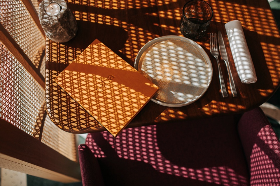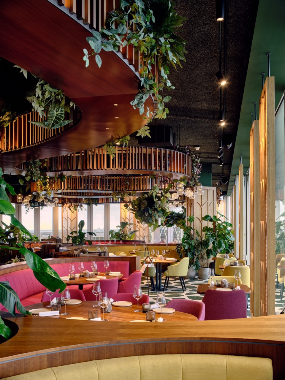 The floor-to-ceiling glass façade is partially covered with wicker, rope, and wood panels, filtering sunlight like leaves and creating cozy shadows. Selva Restaurant immerses guests in a lush, vibrant environment with stunning views of Amsterdam.