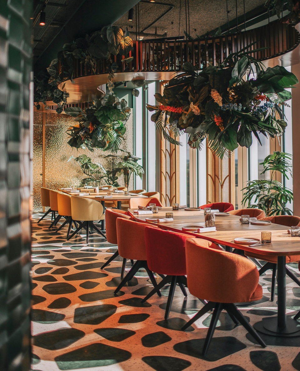 进入餐厅时,客人们将置身于一片充满植物的天花板下,首先看到的是一块悬挂的反光元素,形似热带河流,四周环绕着闪闪发光的玻璃灯具和郁郁葱葱的植被。