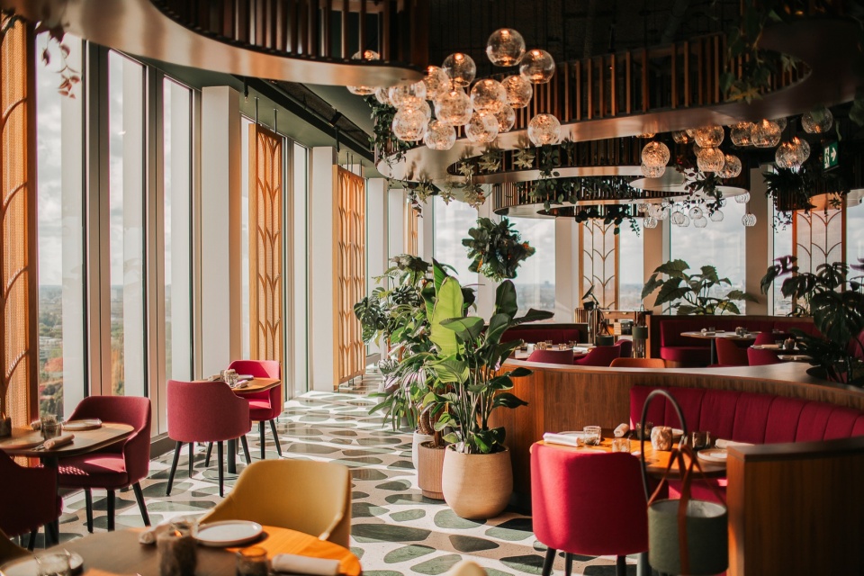 落地玻璃立面部分被藤条、绳索和木板覆盖,这些材料过滤阳光,如同树叶般投下温暖的阴影。Selva餐厅让客人沉浸在一个郁郁葱葱、充满活力的环境中,同时还提供阿姆斯特丹的壮丽景色。
