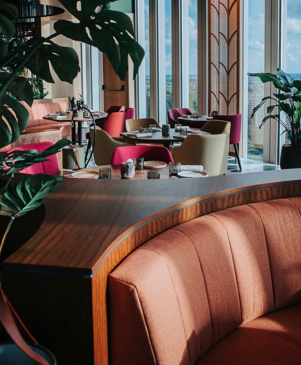 EL EQUIPO CREATIVO has completed the interior design of Selva Restaurant in Amsterdam. Located on the 24th floor of the Nhow Hotel, Selva Restaurant offers Latin American cuisine with a tropical twist. The restaurant’s design blends organic shapes, natural materials, and vibrant colors to create a lush and exotic experience. Additionally, sharing the same floor, but in separate spaces, the Sonora Cocktail Bar complements the experience with bold tropical cocktails (see below for Sonora Cocktail Bar press kit link).