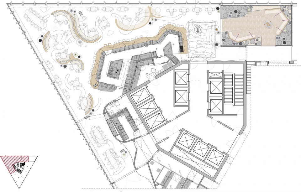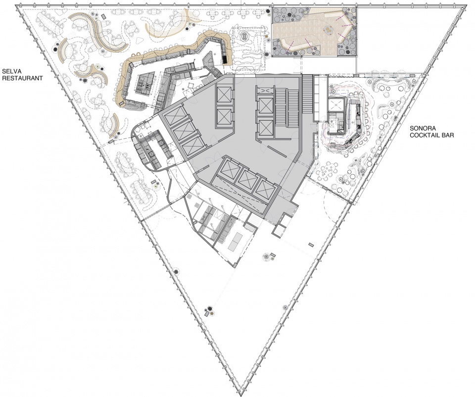 Set against a green backdrop, with organic-inspired flooring and abundant vegetation, the firm incorporated textured wooden elements with flowing shapes that serve as benches and dividers. These elements evoke a forest-like atmosphere, adding warmth and creating inviting paths that soften the space.
