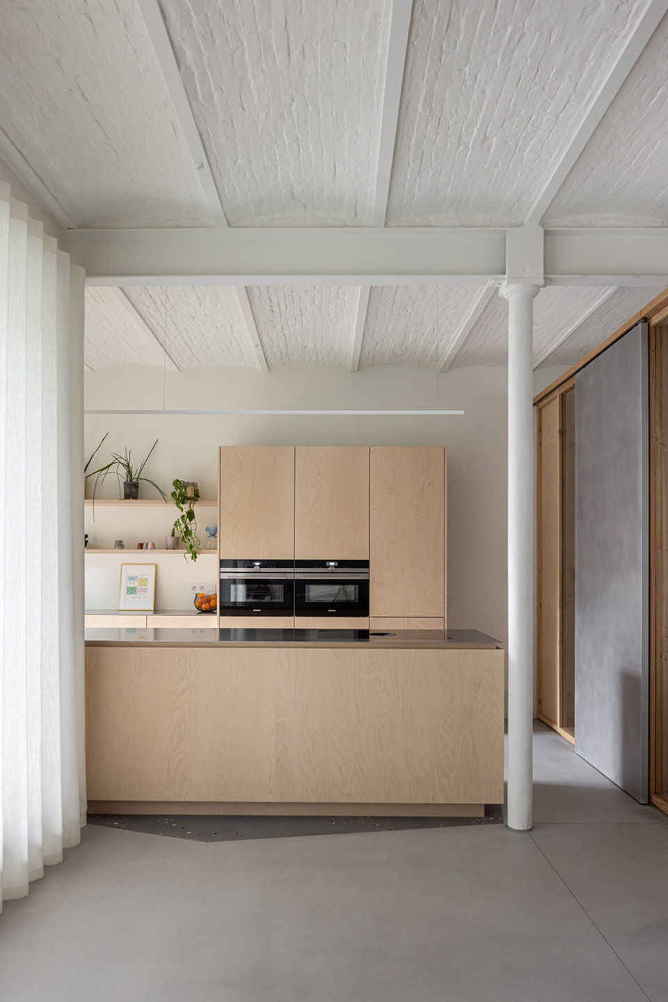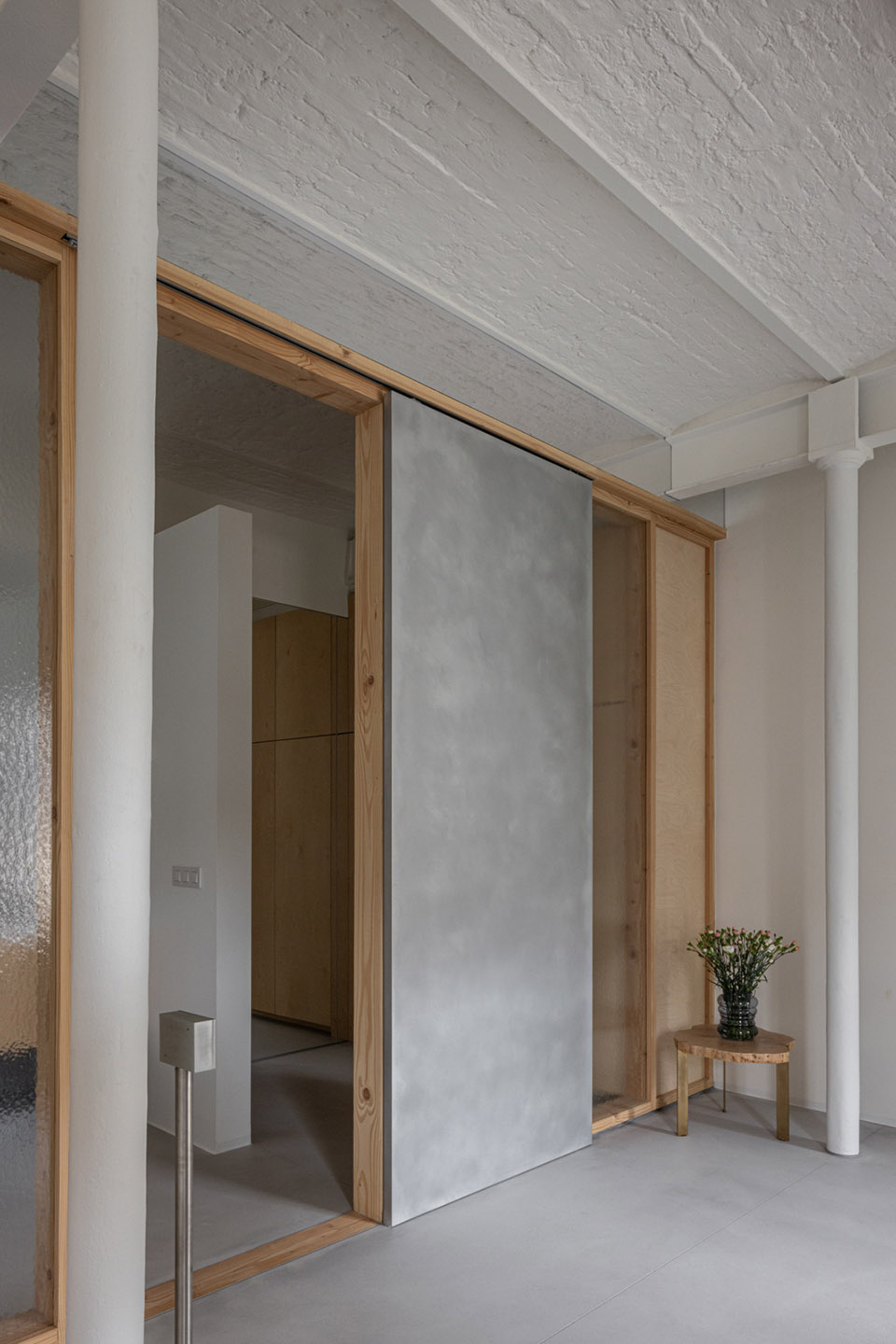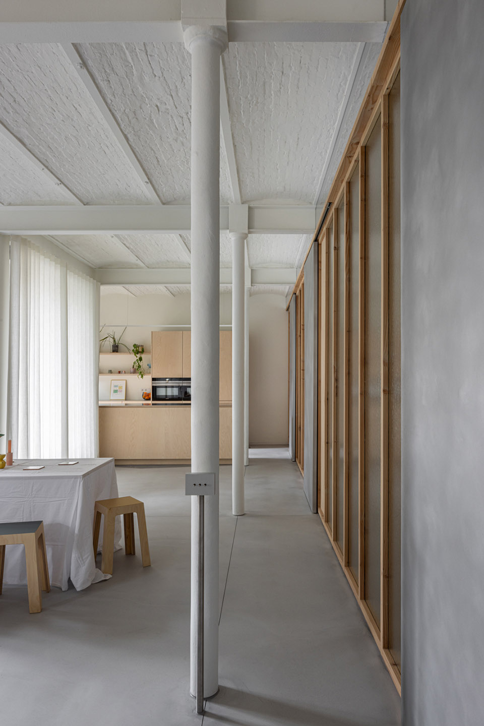 Where the resident requires more privacy, textured glass was used. The moving elements are made from a different material than the fixed parts, so that the sliding doors are highly intuitive to use. By leaving the panels open, the feeling of a loft is kept alive, but if need be, the resident can also retreat in peace and quiet behind closed panels, which separate her from the other residents but with still a lot of natural light to enjoy.