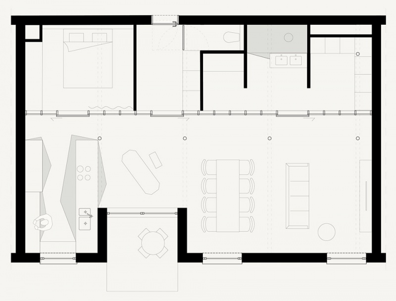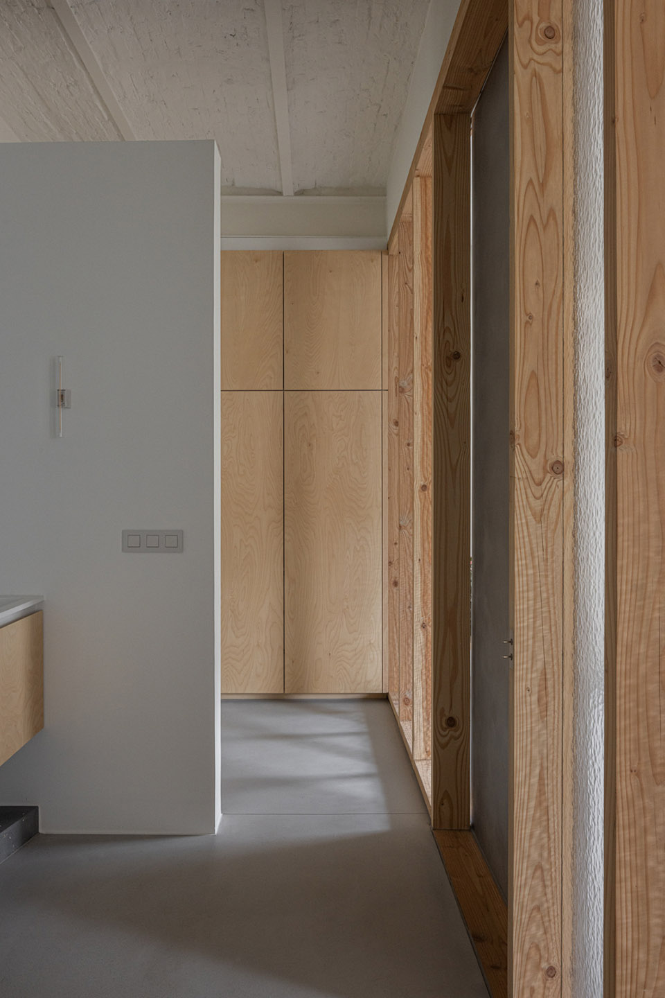 建筑师在细节设计上投入了大量关注,不仅是为了美观。例如,将灯光开关设计成独立的美学对象,并根据实际使用需求合理定位。这种设计强化了设计理念,即希望通过微妙的方式引导住户流畅地穿梭于不同的功能空间。同样,在厨房和浴室的固定家具周围,采用了不同的地面材质。这种设计通过暗示性的意图,在没有实体隔断的情况下划分了空间。