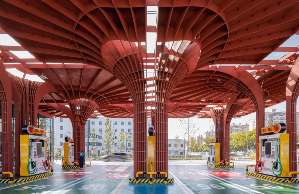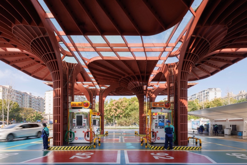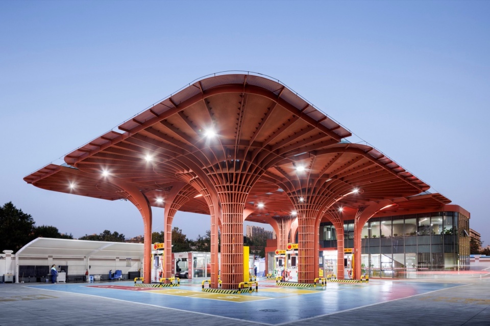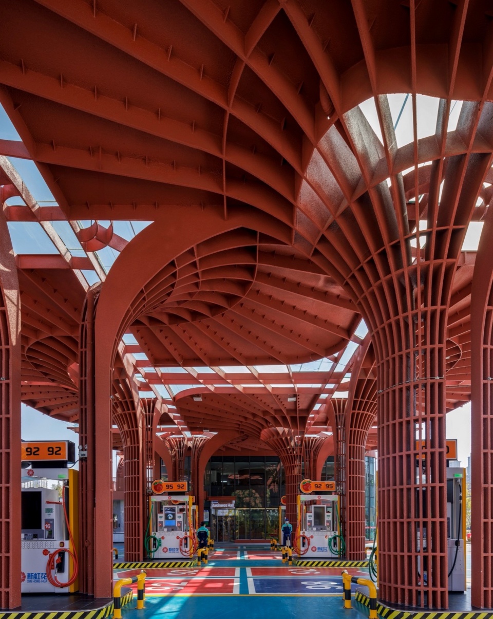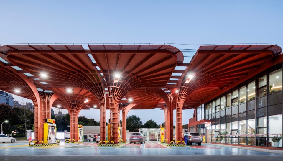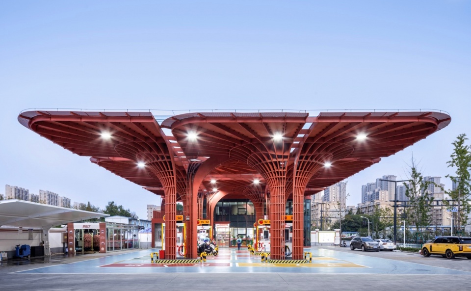 加油站设计以建筑设计为抓手 ,整合了功能 、形态 、文化 、城市性等多种要素和信息 ,让基础设施转变成为高品质城市驿站 ,让简练隽永的几何红花绽放在红花盛开的地方。