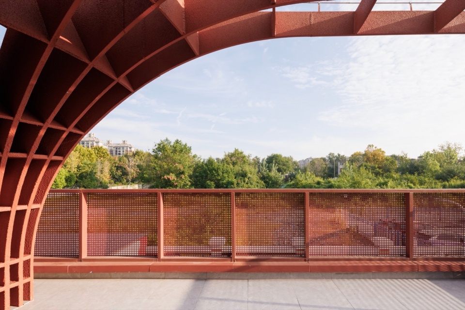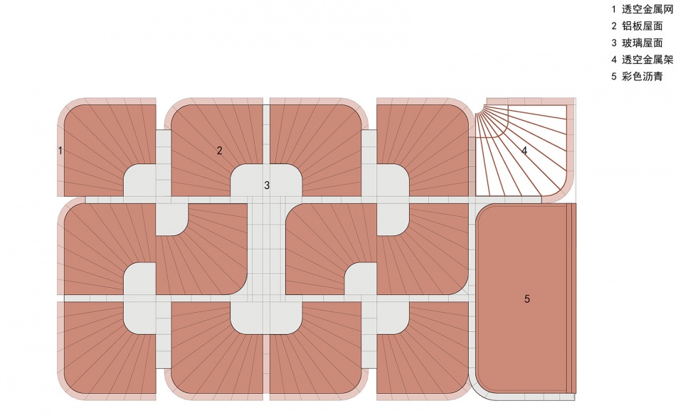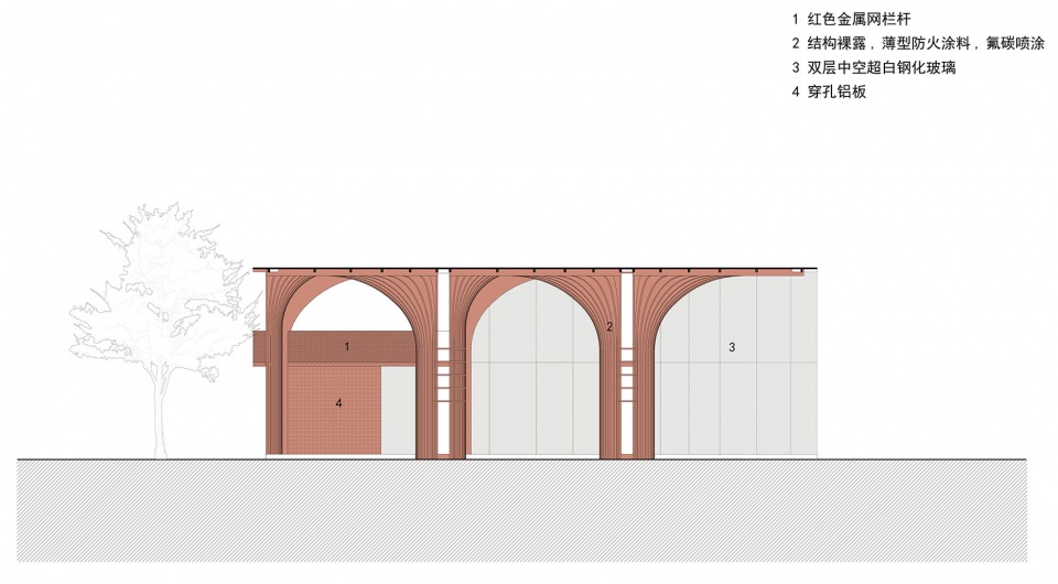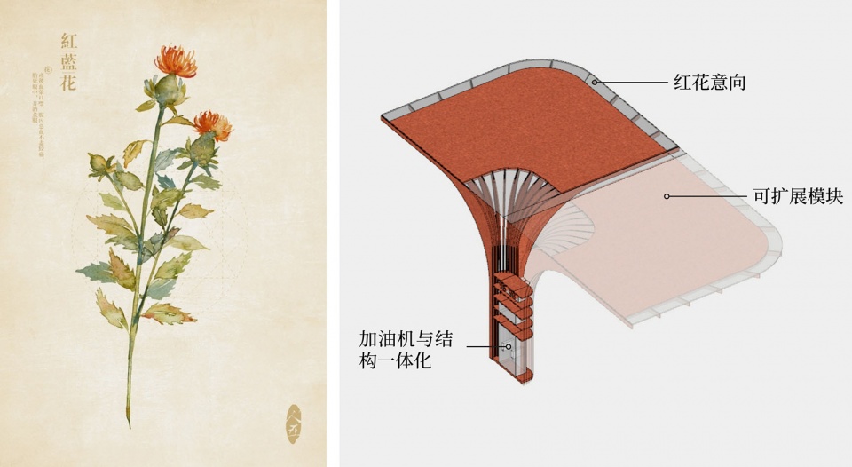 项目这个区域被命名为“ 红花 ”,来源于一种名为红蓝 花的植物 ,寄托了人们美好的想象 ,也形成了此地独特的集 体身份认同 , 因此“ 红花 ”成为了形态创作的最初动机 ,也是对于在地文化的呼应 。设计团队对于红花的形状特点进行解读和结构化重构 ,形成单元化的红花绽放的形象 , 以不同方向互相搭接的红花单元组合成为罩棚 ,并延伸到建筑内部, 定义出了使用空间。在“ 红花 ”的形象塑造中 ,采用了几何简化和抽象化的策略 ,这样的表达让建筑规避了过分具象和世俗化的风险,也让建筑可以有更多的可阅读空间和更多的理解的可能性 ,使得建筑的审美可以更加耐久和经典 。建筑的红色也没有选取标准的大红色 ,而是仔细控制其明度和饱和度 ,让其既能吸引目光又足够融入周边的城市环境。