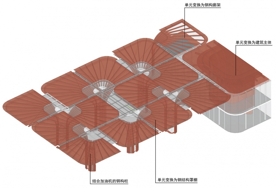 站房罩棚一体化: 罩棚的高度和二层建筑的高度相同, 拼合的罩棚和站房相连成为一体 ,统一了加油站最重要的两个空间要素 ,一改大量存在的两者分置的状态 ,钢结构的形态特点在站房内部也加以呼应 ,人们的空间感受得到了统一。