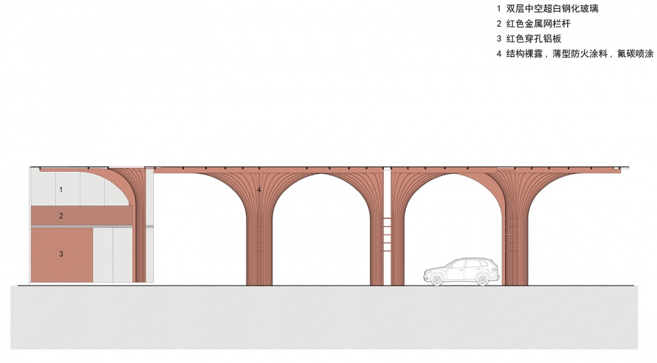 结构形态一体化:根据一束束的红花的形态特点和轮廓特征 ,采用一片片弧形切割的扁钢形成空间形态 ,同时梁柱延展完成了建筑的结构支撑 ,在外立面的装饰中并没有做额外的包覆,只是做了颜色的涂装 ,完整的展示了结构体系, 也让整个建筑充满了理性 、逻辑的结构之美。