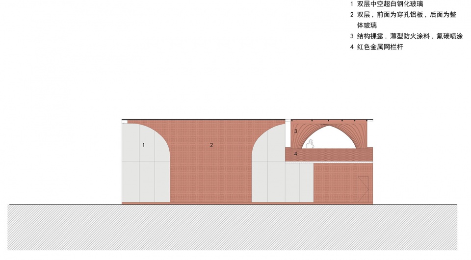 加油站本身必须满足安全要求和功能要求 ,其空间一般可以分为作业区和辅助区 ,周边需要有隔离 ,设计团队在充分尊重并满足规范的前提下 ,尽量做到公共和开放 。在与周边地块的隔离上 ,仍然采用实体围墙 ,但是与城市转角人行道的隔离中 ,采用了通透栏杆和绿植相结合的方式 ,保证了作业区的安全管控要求 ,也满足了建筑的有效呈现和城市转角的通透性。与此同时,设计团队挖掘了辅助区和站房内部的空间潜力 ,在界面上 ,尽量采用落地窗或玻璃幕墙 ,让内部的便利店功能充分外显 ,并将出入口尽量设置于转角附近 ,方便加油和路过的人们进入 ,将内部楼梯外化,并将二楼的走道加宽,连接到二层“ 红花” 下的观景平台,人们可以在具有丰富感受的一系列开放空间内休憩探索 ,为可能的文化展示创造条件 ,进一步增加了开放空间的复合性。