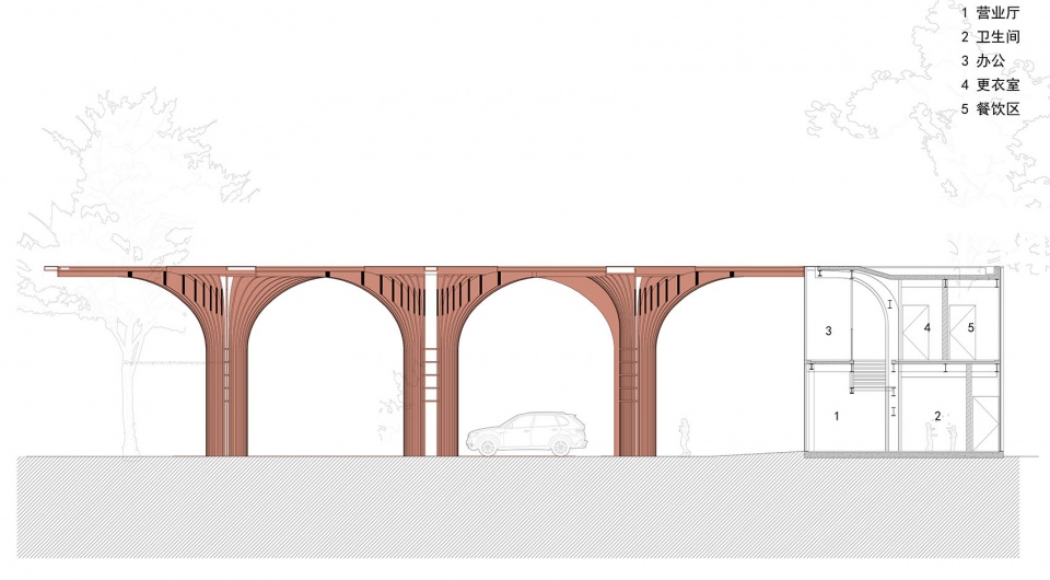In the design of the gas station building, the strategy of “integration” was employed at multiple levels to ensure the overall cohesion and clarity of the theme.