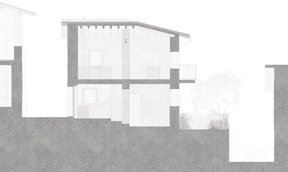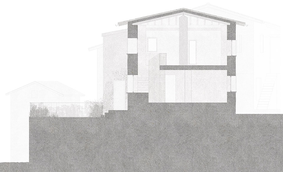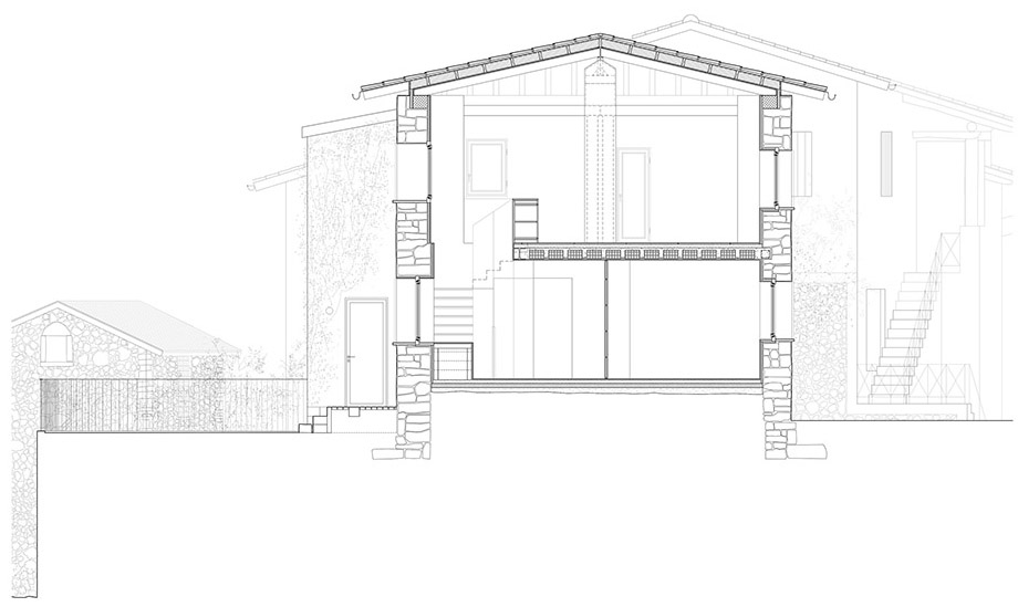 Following a subtractive approach, part of the ground floor was excavated to adapt to the slope of the rockyterrain, restoring a connection with the garden. This created two separate entrances at different levels, allowingaccess to the ground-floor sleeping area, while the living space was moved to the upper floor to make the mostof the view of the valley and its ravines, as well as the increased light and height provided by the pitched roof.