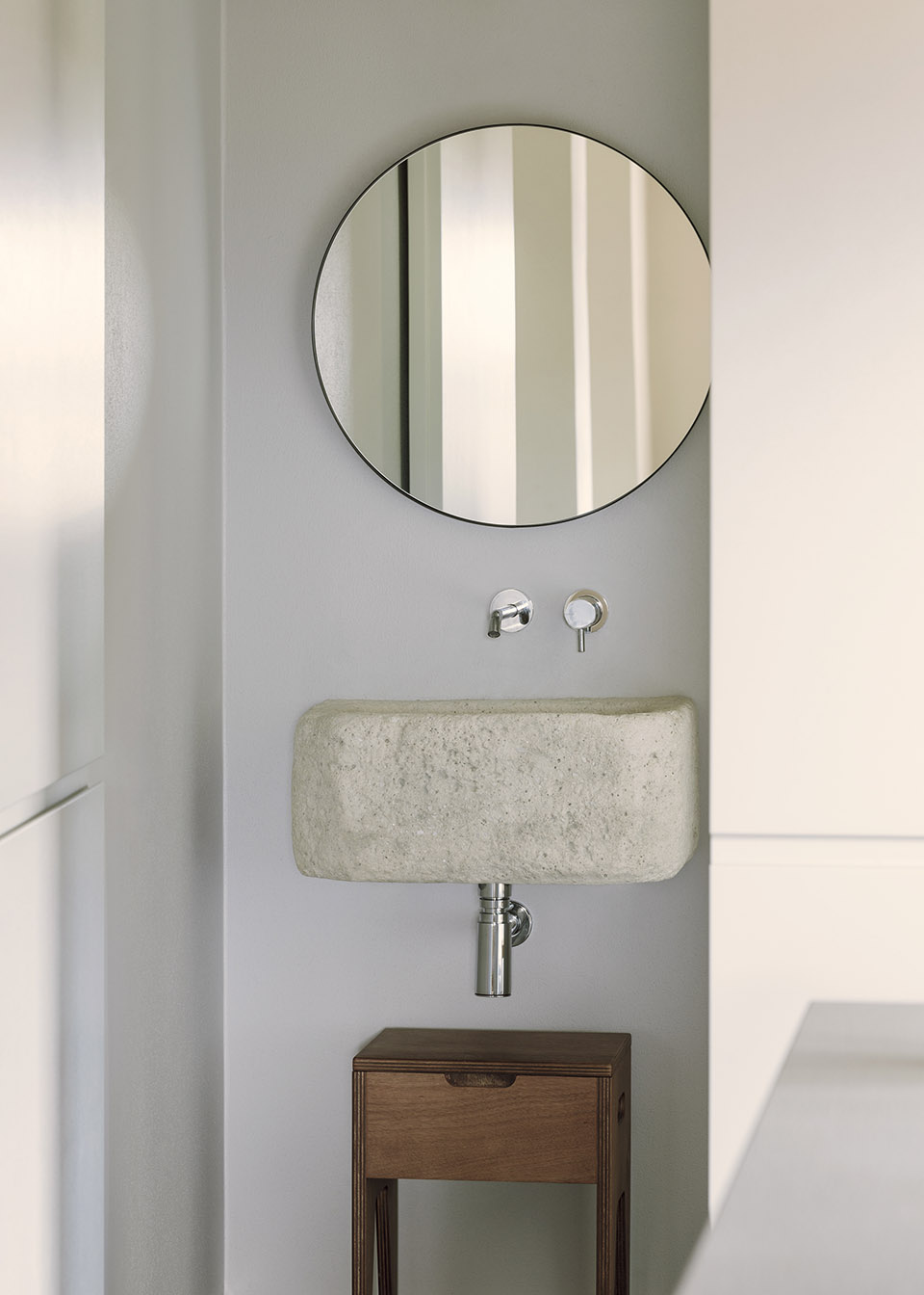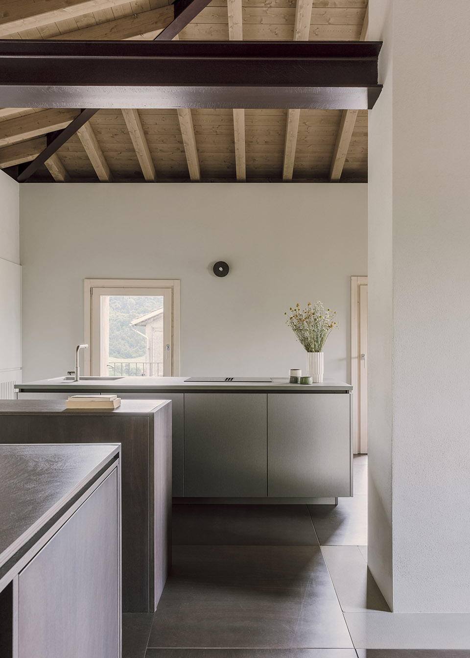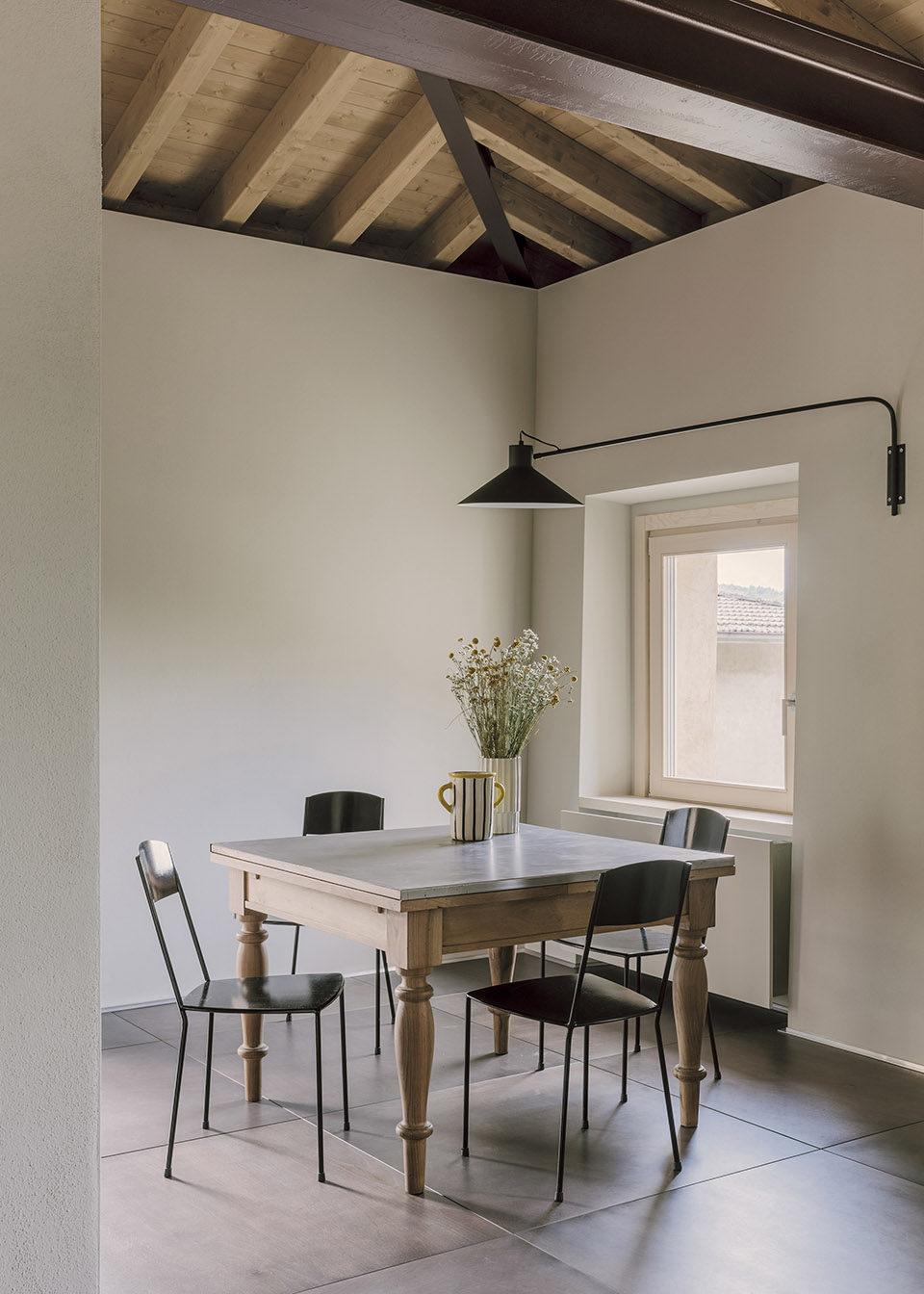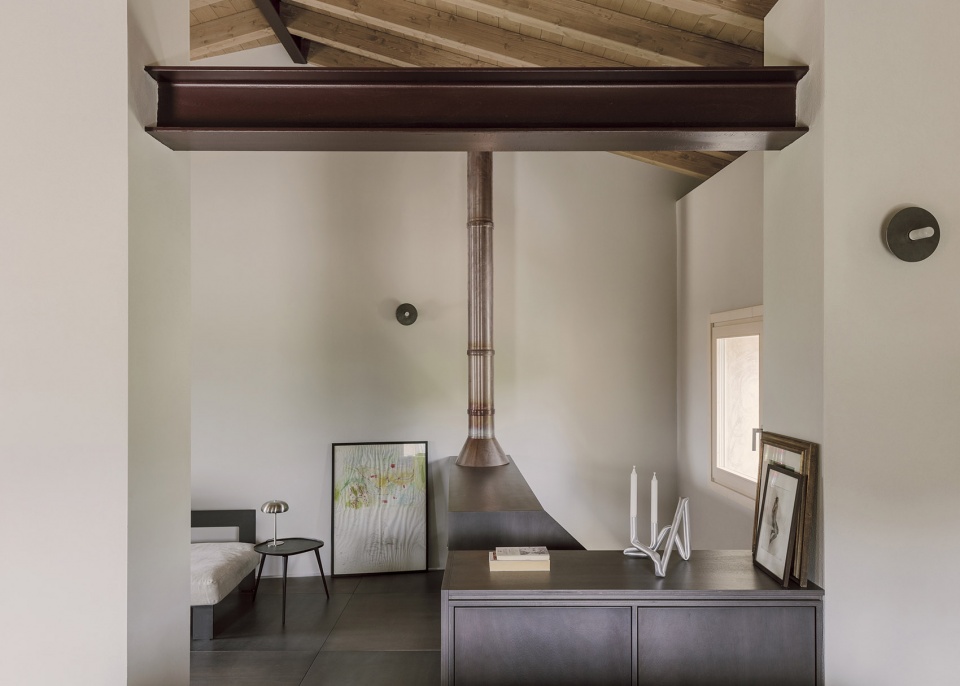 The kitchen, custom-designed in steel with a countertop made from local stone, contrasts with some hi- storicfurniture pieces that have been restored and transformed, creating a balanced system along with new seating and an iron-framed sofa, which echoes various custom-designed accessories in the home, such as the wall-mounted lamp holders.