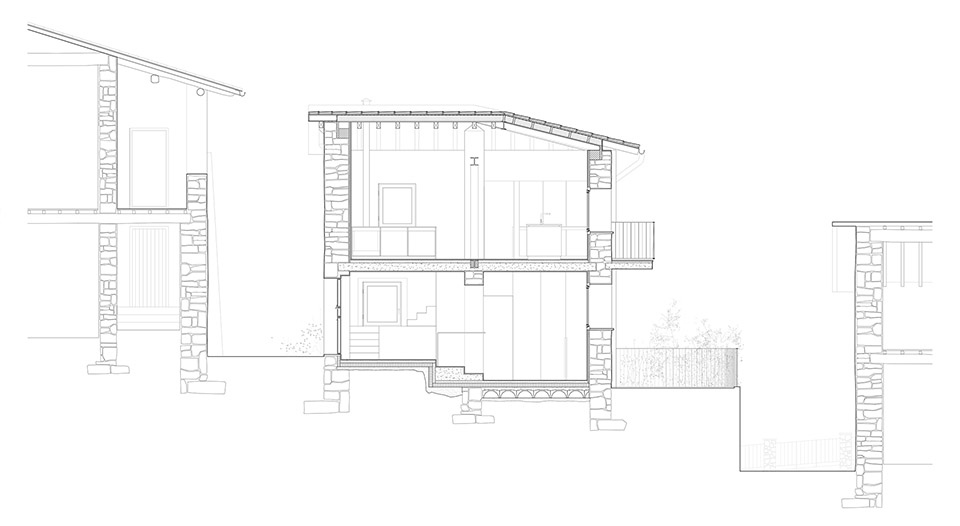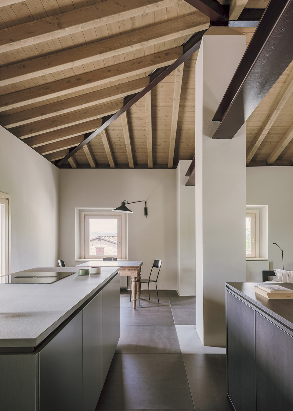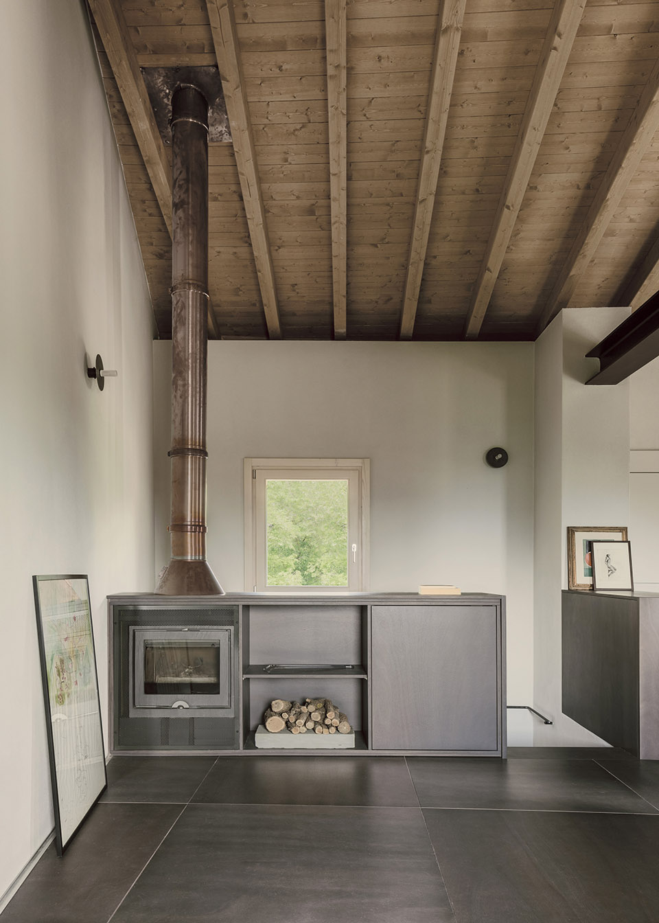 Structurally, the historic building was renovated with a new roof in wood and steel, minimizing its thickness.Furthermore, a structure of metal beams and a central pillar on the first floor allows the living area to open up completely, highlighting the existing windows in the historic stone facade wich acts as paintnings framing thevillage surrounding the living room.