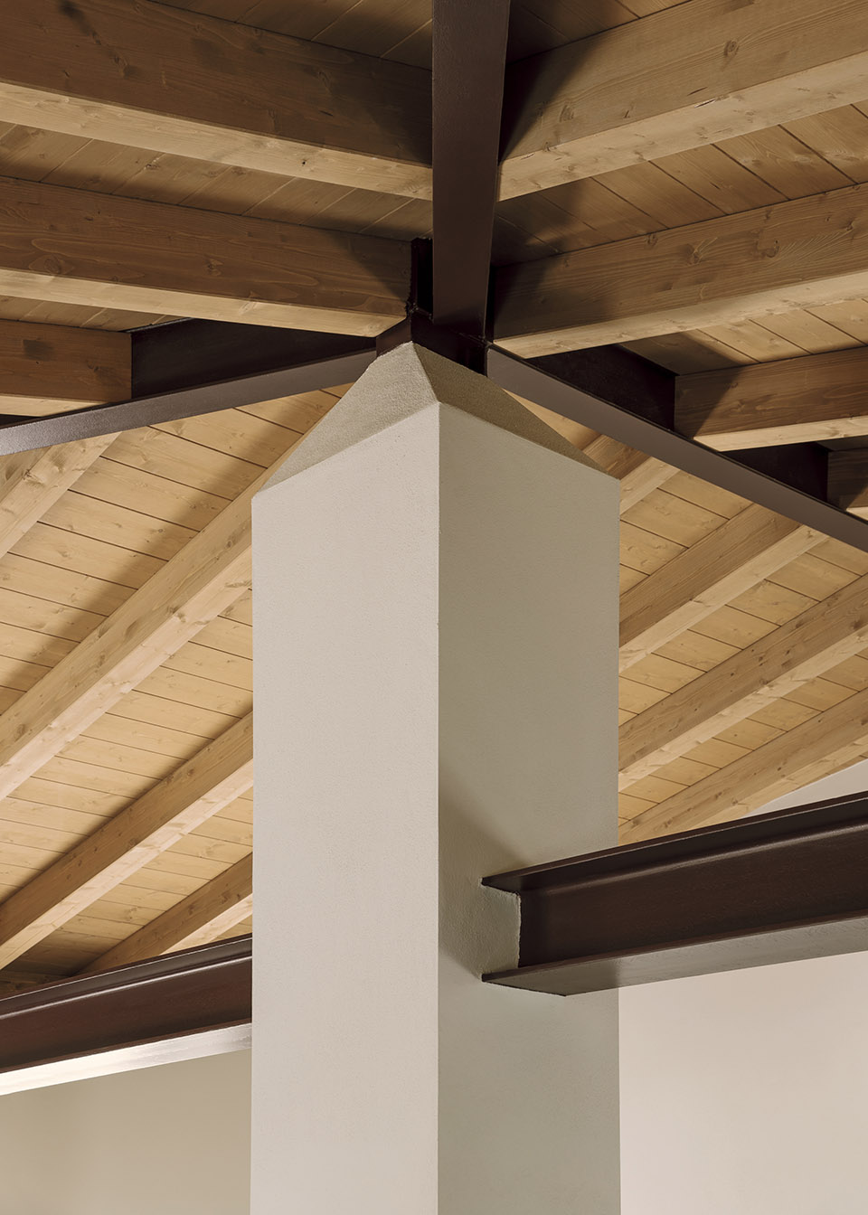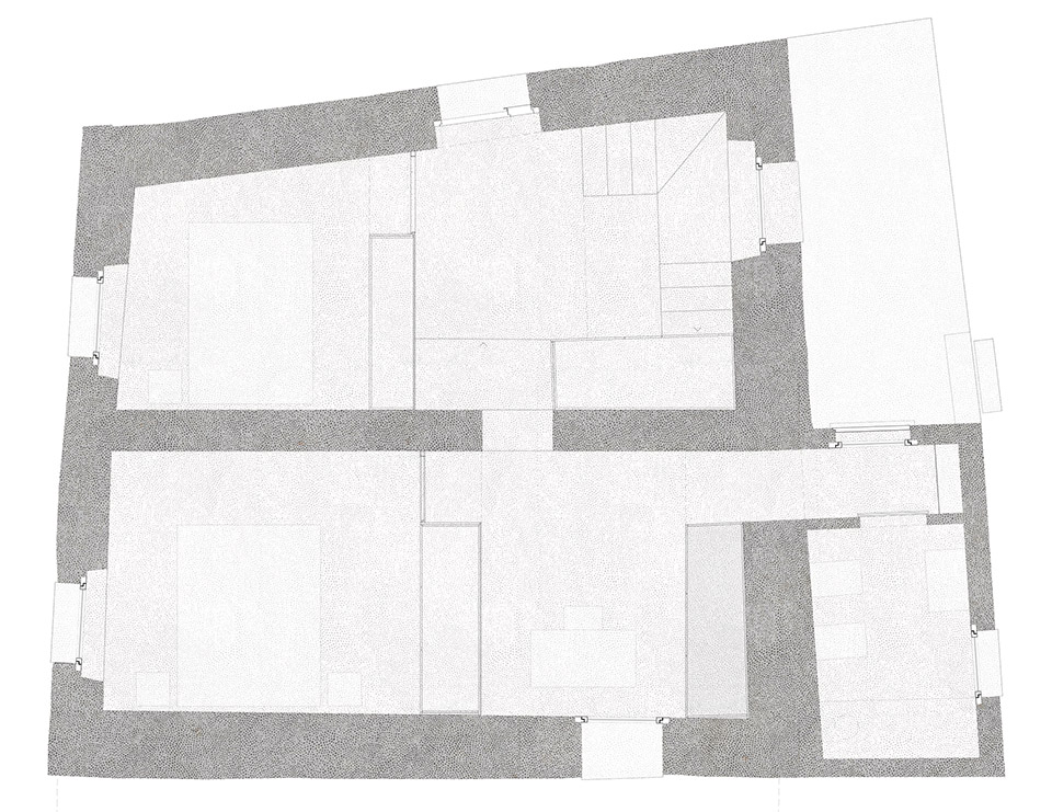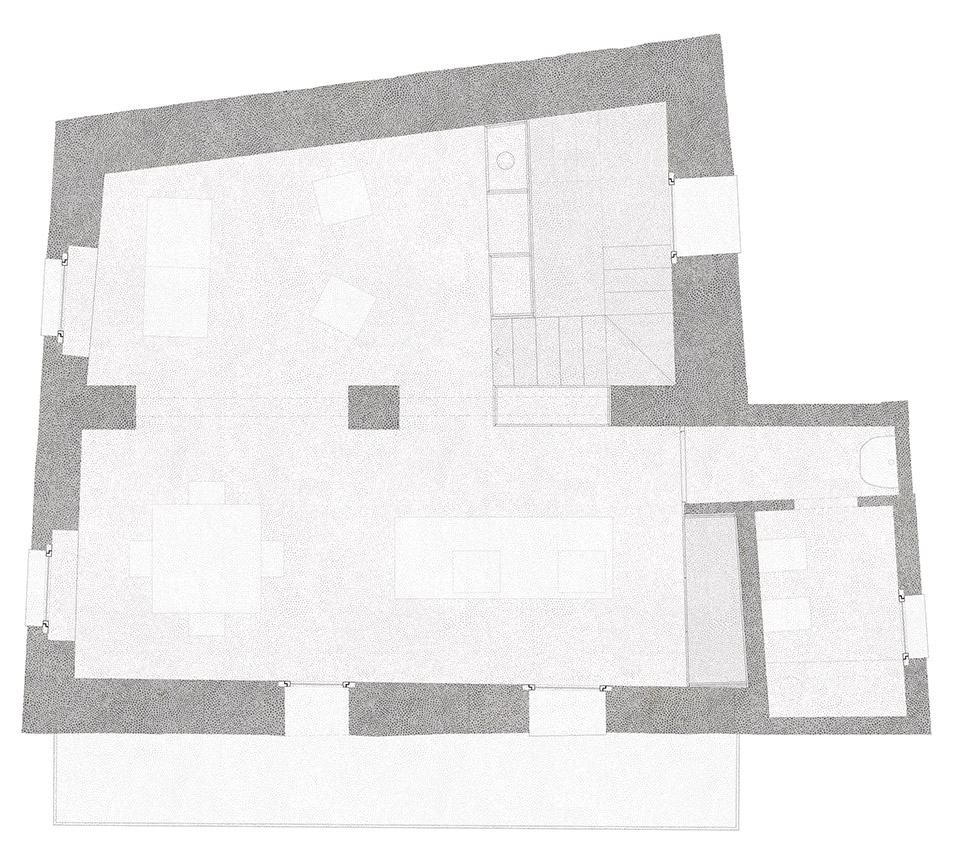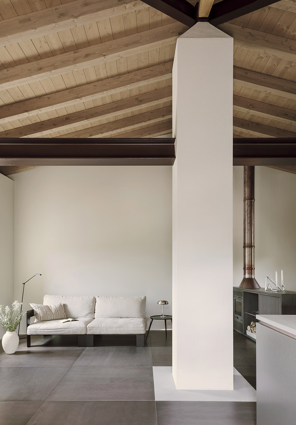 Structurally, the historic building was renovated with a new roof in wood and steel, minimizing its thickness.Furthermore, a structure of metal beams and a central pillar on the first floor allows the living area to open up completely, highlighting the existing windows in the historic stone facade wich acts as paintnings framing thevillage surrounding the living room.