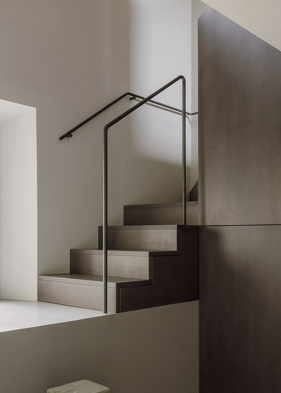 Dark Okoume wood was used for interior partitions, upper floor flooring, and the new staircase, creating a strongmaterial and color contrast with the rest of the house, underscoring the relationship between the historic structure and the new additions.