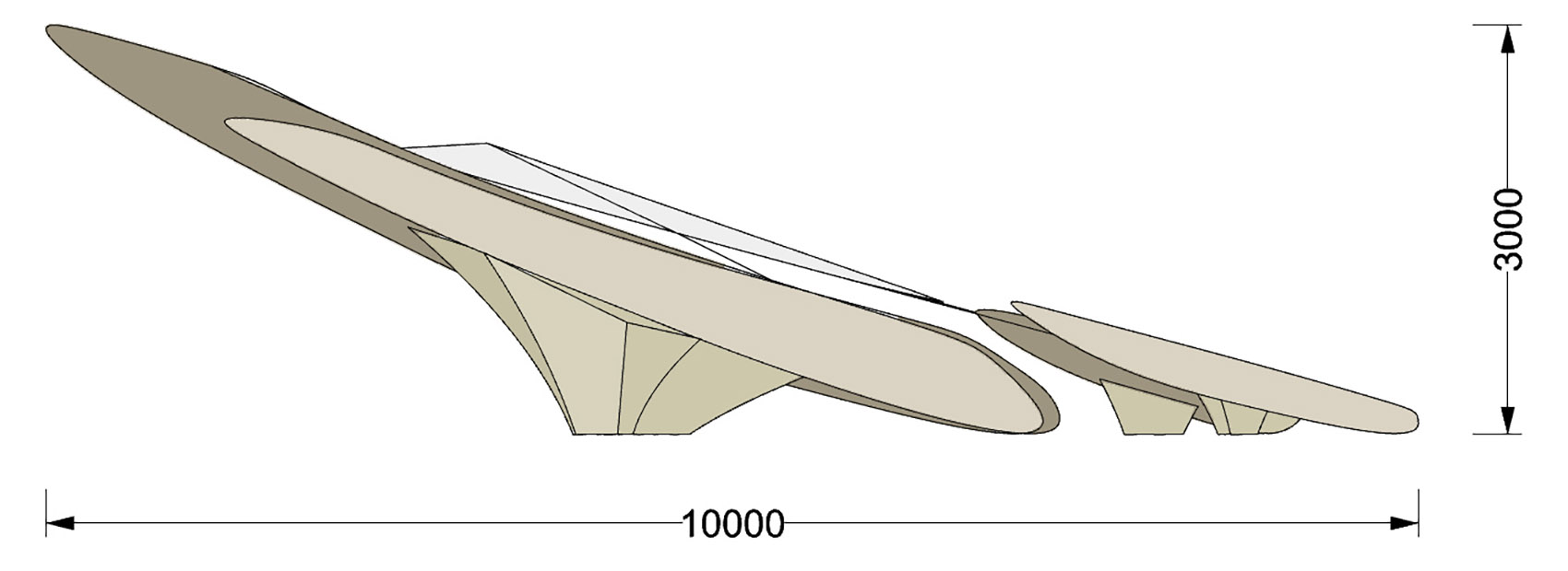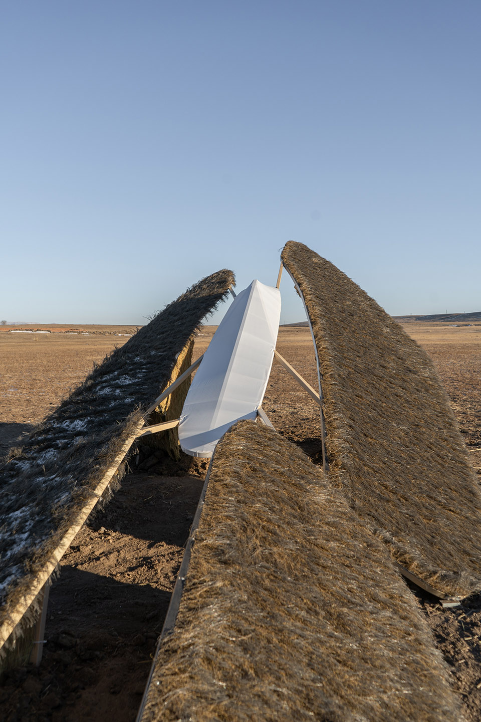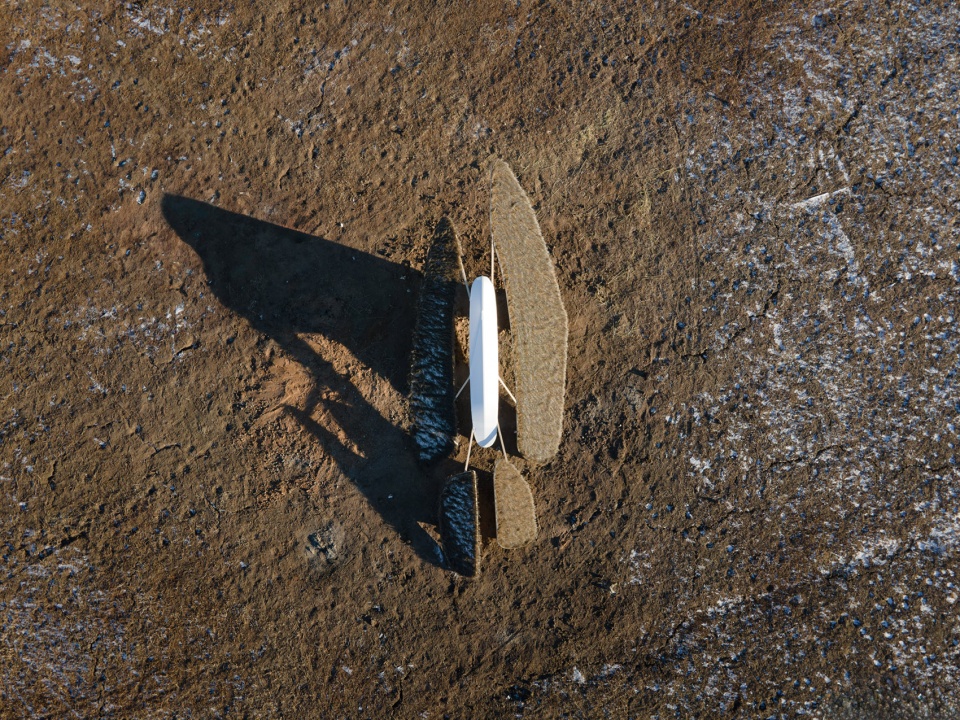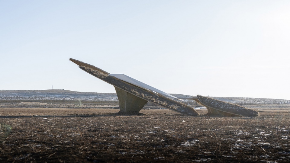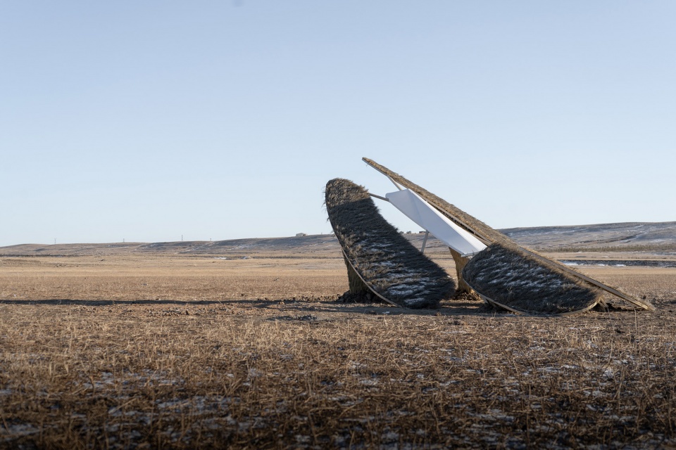 装置整体外形如同一只即将振翅高飞的鸟,又如一艘准备离地的飞船。飞鸟象征草原生命的灵性与自由,而飞船代表着未来的科技与探索精神。两者的结合寓意着草原文化在传统与未来之间的跃迁,表达了永不停息的进取与想象力。从西方看去,装置与坐落于村落中的“草原方舟”相互呼应,草原方舟连接着地球和宇宙,也连接了草原和牧民。而OAS/S-NOMAD连接着远古与未来,也连接了人与自然,两个作品朝向不同的方向,但却有相同的美好寓意和共同理想。