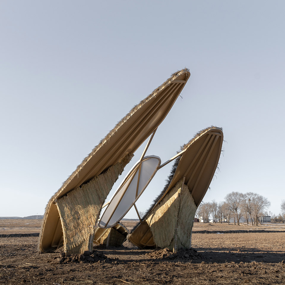 The structural lines and forms of the installation are like the smooth and vital natural strokes in hieroglyphics. This design language not only conveys the ancient charm of grassland culture, but also captures the dynamic beauty of the natural world in an abstract way, symbolizing the original symbol system of human beings’ initial communication with nature. Looking down at the installation from the air, the installation stays on the grassland like cattle and sheep, echoing the cattle and sheep in the village. The textured outer skin blends with the winter grassland, symbolizing the freedom and symbiosis of nomadic culture.