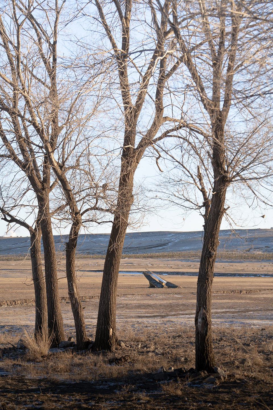 装置的结构线条和形态似象形文字中流畅而富有生命力的自然笔画。这种设计语言不仅传递了草原文化的古老韵味,也以抽象的方式捕捉了自然世界的灵动之美,象征着人类最初与自然沟通的原始符号体系。从空中俯瞰装置,装置似牛羊一般停留在草原上,与村落中的牛羊相互呼应,富有肌理感的外表皮与冬日的草原融为一体,象征了游牧文化的自由与共生。
