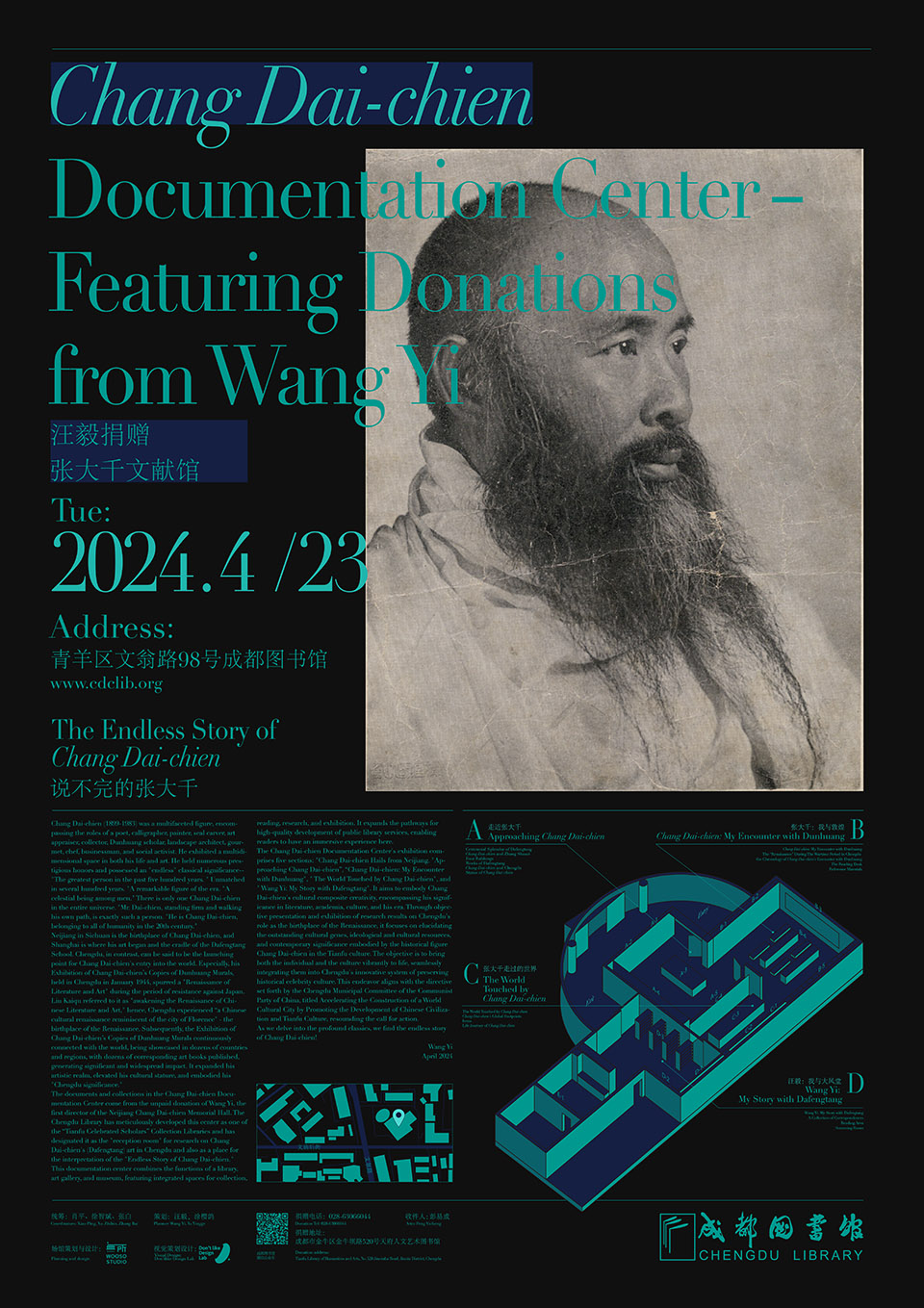 The project originates from the personal collection of Wang Yi, the first director of the Neijiang Chang Dai-chien Memorial Hall. The documentation center showcases Wang Yi’s 34 years of research outcomes on Chang Dai-chien (Dafengtang), featuring nearly 10,000 items such as works by Chang’s disciples, letters from his family, and other historical documents. After taking on the project, we collaborated with Don’t Like Design Lab to organize the entire collection, study and sort all research outcomes and documents, and complete the planning and design of the documentation center. The proposal not only includes the design of the space but also features several information charts that offer a multidimensional view of Chang Dai-chien’s life, his stories with Chengdu, and his deep ties to Dunhuang. This makes the documentation center not only a gathering place for Chang Dai-chien researchers but also an accessible space where general visitors can quickly understand his historical contributions. Therefore, it will further promote the development of Chang Dai-chien research activities.