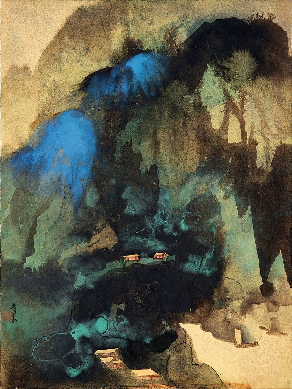 The dominant hue of the center is inspired by Chang Dai-chien’s landscape paintings and his signature technique—splashed ink and color. The colors of “stone blue” and “stone green” on the canvas blend memory with imagination, creating a scene that is both dreamlike and poetic. He was a master of color, and these shades of green and blue are among the most lasting impressions he left for future generations.