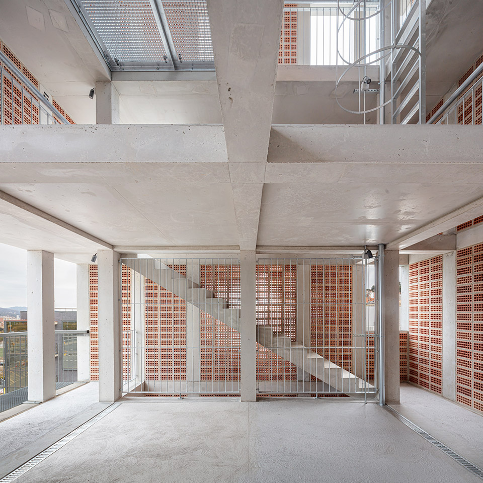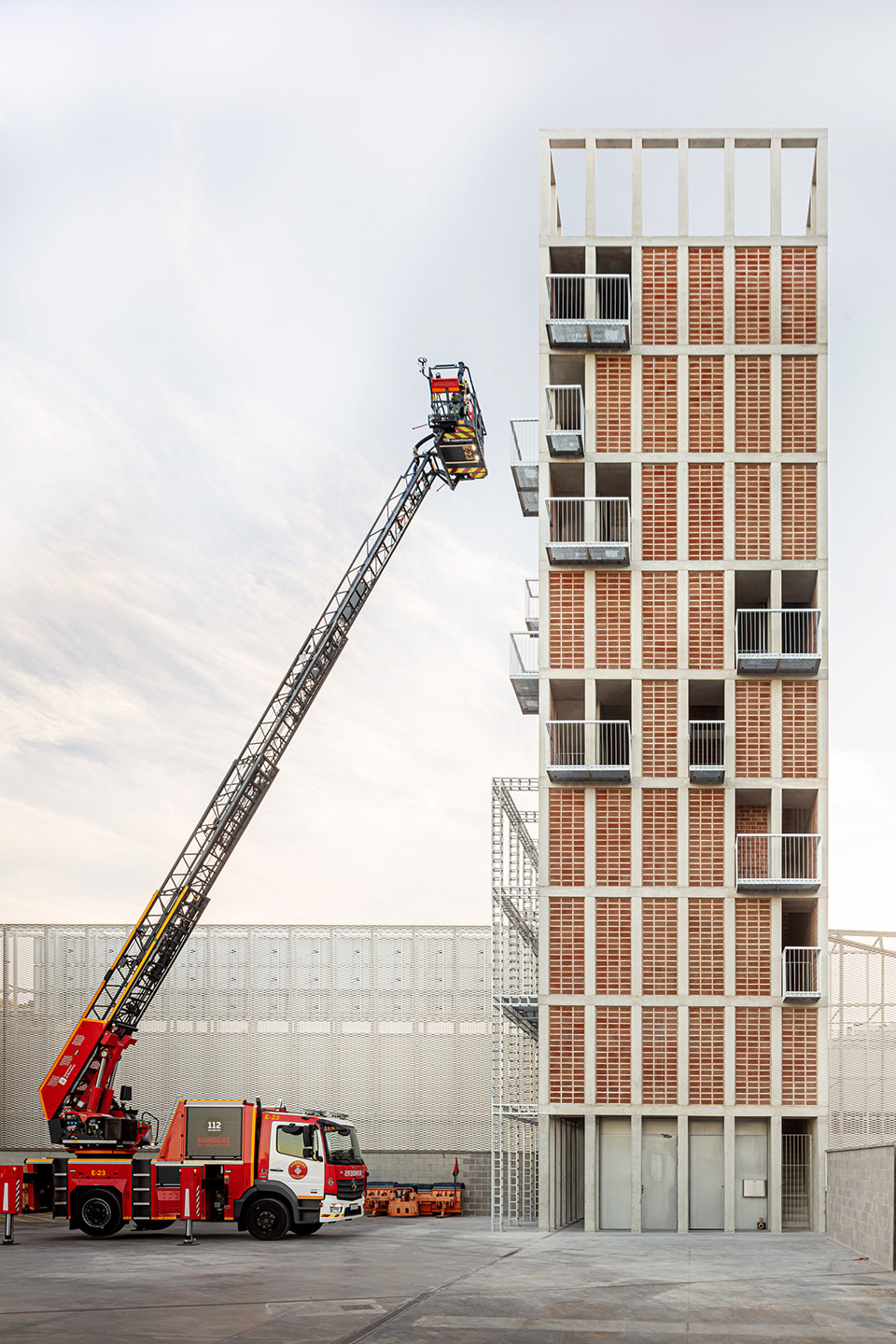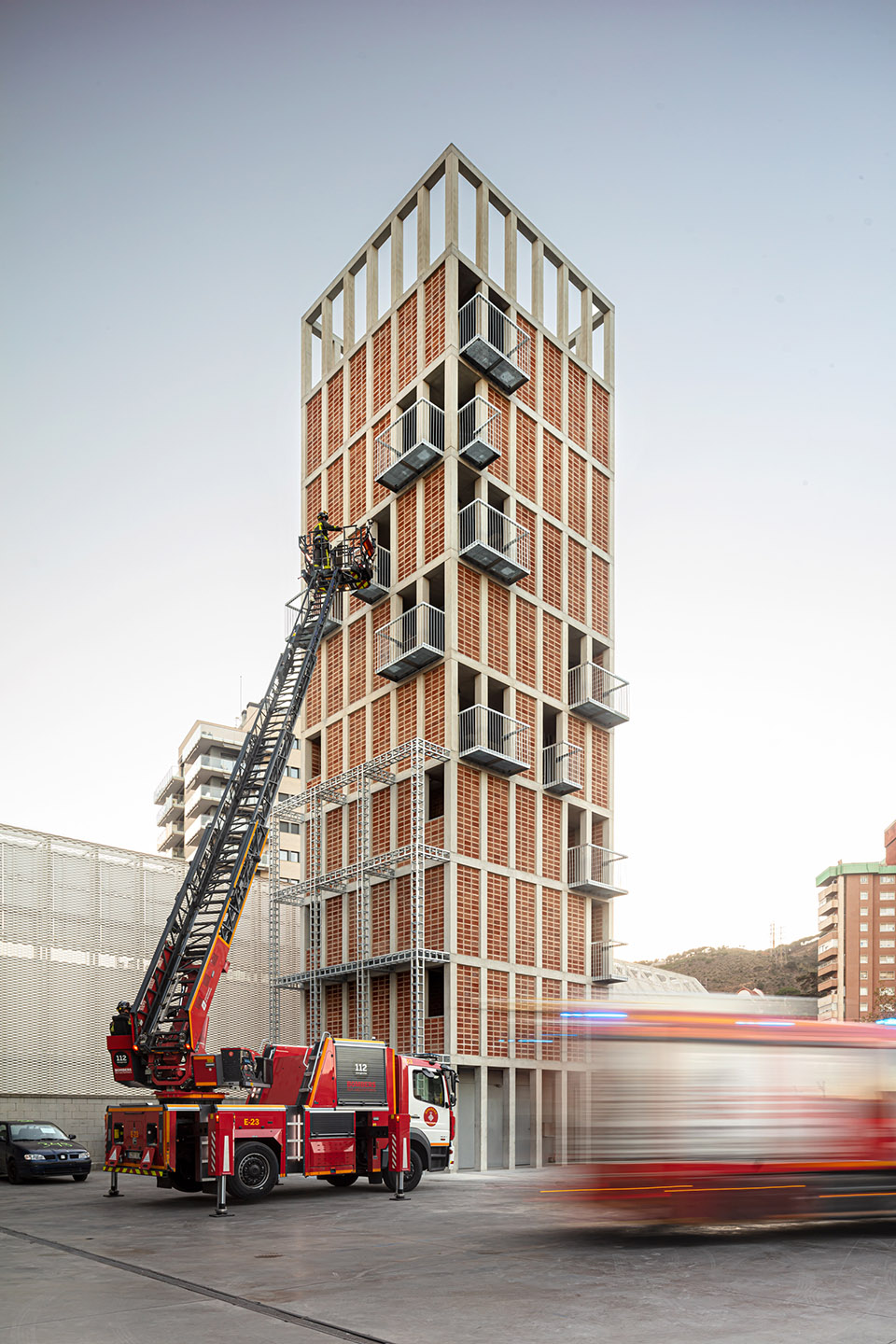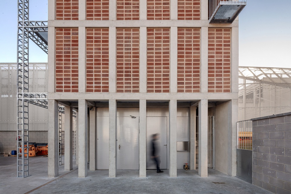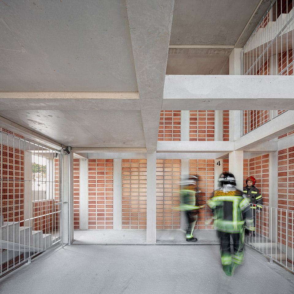 The structure is configured by a central core formed by 8 concrete pillars measuring 25 x 25 cm, intertwined by girders of the same depth in the shape of a cross, and a second level of 24 pillars on the façade that guarantee the resistance to the horizontal thrust required to rappelling practices. The new tower will extend the fire station’s existing structure by executing a transition slab that coincides with the roof of the maneuvering yard. The envelope is configured as a perimeter circulation space that gives access to all the elements of the façade and that, in turn, allows the different levels to be connected without interfering with the activities that can be carried out inside, promoting a great simultaneity of the practices. The exterior enclosure is designed from the modulation of the 28 x 12 x 18cm extruded ceramic piece, avoiding cuts and losses, placed with the holes seen to form a large lattice. Ceramic has good inertial behavior and low conductivity, helping to regulate the interior temperature, especially in the summer months when the outside temperature can exceed 35º. Finally, some light metal elements are added that make up the cantilevered balconies as well as slabs, stairs and interior railings. These elements are prefabricated in the workshop to speed up placement and allow for future modifications.
