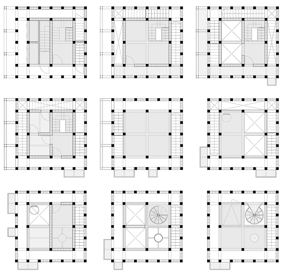 塔楼作为一个开放系统,具有极大的灵活性和功能适应性,以容纳当前的功能需求,并预见未来使用功能的变化。塔楼的平面为7.15平米见方,基于混凝土柱和横梁的网格结构,形成一个三维网格,每层通过该网格形成四个2米×2米的空旷区域,从而为适应多种空间需求提供最大灵活性。室内空间模拟各种极限场景,让消防员能够进行各种训练(双层和三层空间、螺旋楼梯、猫梯、井口、门窗等),而外部则设计有不同位置的阳台,增强了绳降和垂直救援训练的效果。