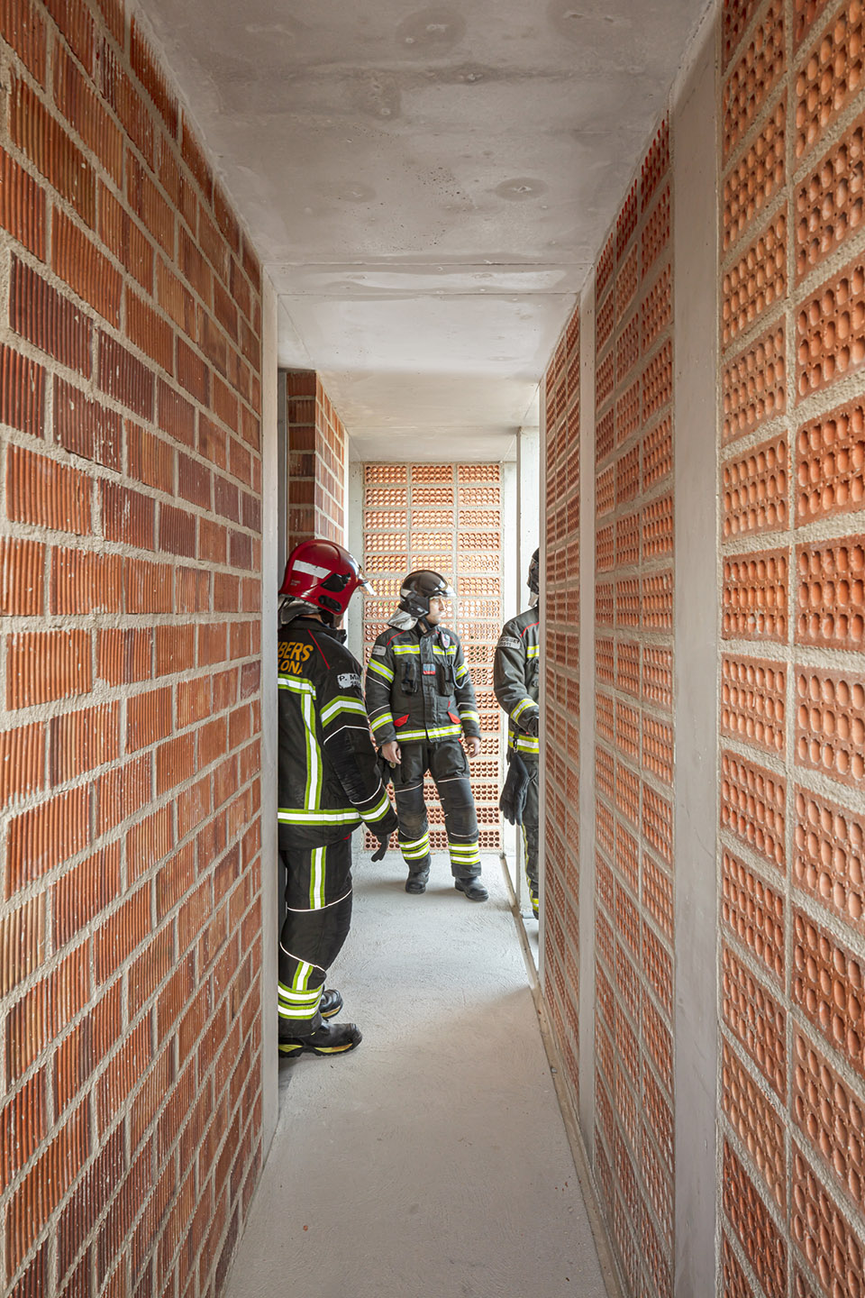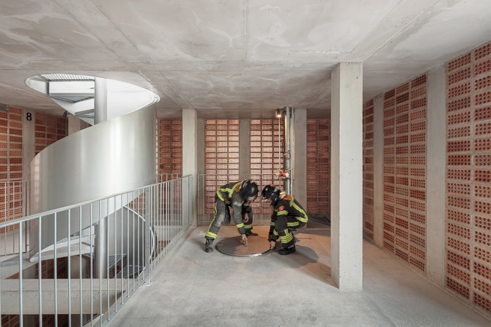 结构由一个中央核心组成,核心由8根25 x 25厘米的混凝土柱构成,通过同样深度的十字形梁相互交织,外立面则有24根柱子,确保能承受执行绳降训练所需的水平推力。新塔楼将在现有消防站的基础上扩展,采用过渡楼板与操场屋顶对接。外立面作为一个周边环行空间,与所有外立面元素相连接,同时可以不干扰内部活动的情况下将不同楼层相连,从而促进训练的同时进行。外部围护结构通过28 x 12 x 18厘米的挤压红砖模块化设计,避免了切割和浪费,红砖按孔洞朝外排列,形成一个大型格栅。红砖采用的陶瓷材料具有良好的惯性行为和低导热性,有助于调节室内温度,特别是在夏季外部温度超过35°C时。最后,添加了一些轻型金属元素,用于构成悬挑阳台、楼板、楼梯和室内护栏。这些元素在车间预制,以加快安装速度,并便于未来的调整。