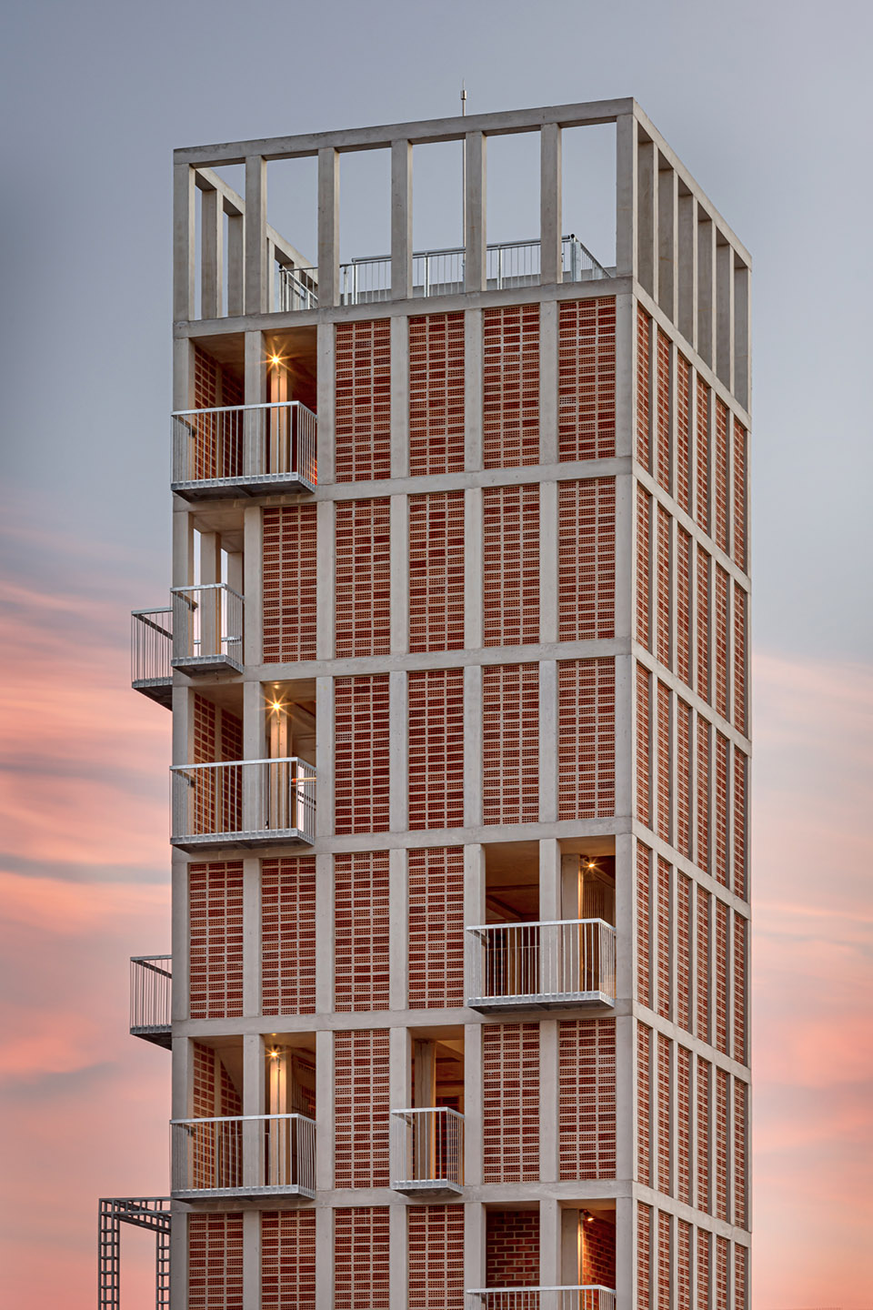 材料的选择不仅考虑了景观融合的标准,还考虑了耐用性、维护性、抗冲击性和施工简便性。项目仅使用了三种材料,这些材料不仅能够实现差异化,还优化了施工过程:混凝土用于结构,红砖用于外立面,而金属元素用于围护结构和阳台。