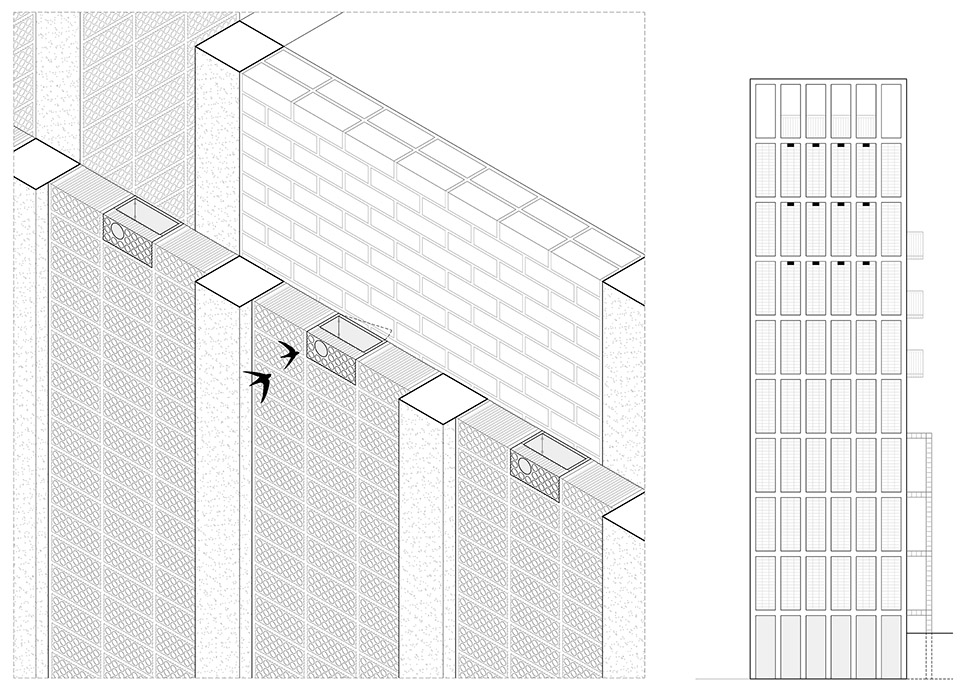 Beyond allowing the development of the planned program, the tower acts as a climatic refuge for people and birds. The façade lattice, made up of very deep ceramic pieces, guarantees permanent ventilation of the interior spaces and allows a reduction in the outside temperature without the use of any artificial air conditioning system. Likewise, 12 swift nests are included in one of the façades in order to promote biodiversity and provide shelter to a species of bird that frequents the Collserola mountain range. In this sense, the project is presented as an infrastructure that will last over time, even beyond its current use. The interior compartmentalization and enclosures allow changes to accommodate other programs and prolong the useful life of the tower, which can also be understood as an urban observation point of the Horta-Guinardo district.