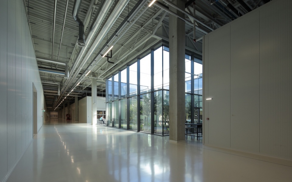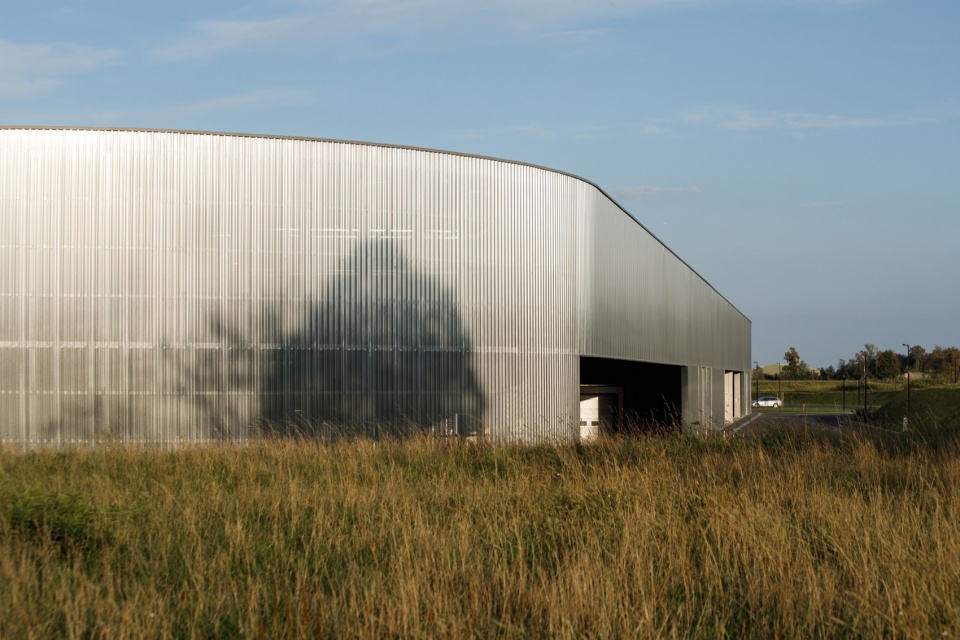 生产建筑的外立面设计为由金属波纹板组成的连续外壳,总长度达到一公里。铝材因其轻巧性和易于安装的特点被选中,特别是在立面角部的曲线设计上具有优势。此外,铝材的反射性使得大体量的生产建筑在视觉上“去物质化”,引发了关于新纪实主义及其与周围空间关系的思考。外壳部分覆盖了穿孔金属板,这既保证了通风,也为外部景观提供了视角。外立面的清晰设计让内部的动态生产过程得以展示。立面上的开口是等高的“切口”,根据其内在逻辑进行设计,这些开口内设置了不同用户的入口和凹槽。