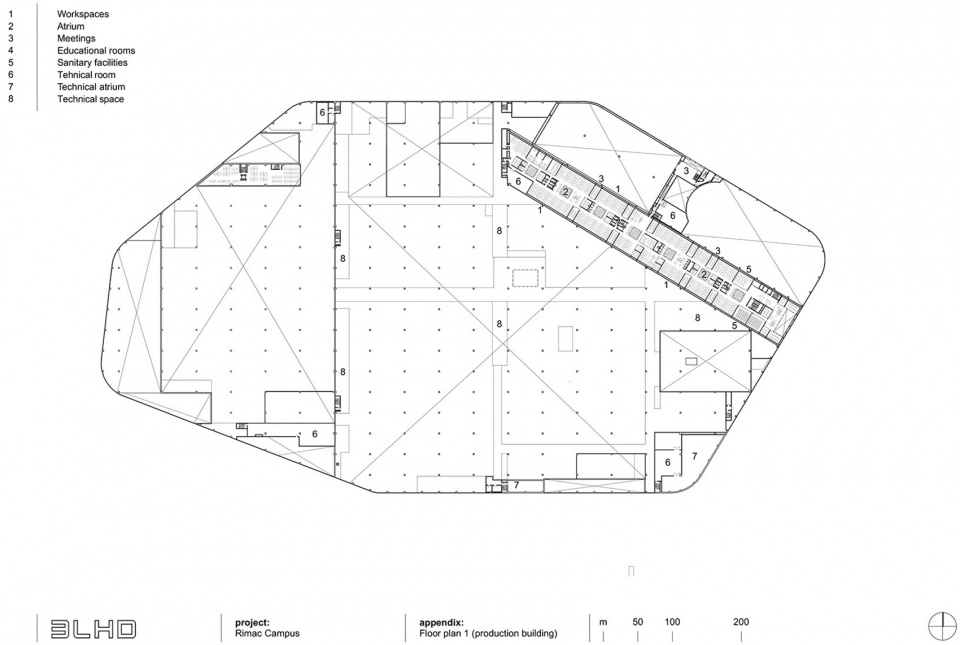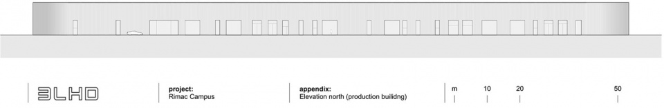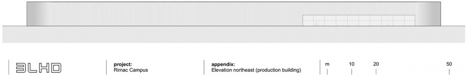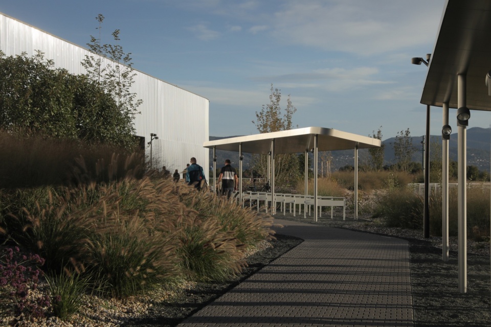 The main design element of the production building is a continuous envelope made of profiled metal sheeting, stretching a total length of one kilometer. Aluminum was chosen for its lightness and ease of installation on the facade, allowing for the necessary curvature at the corners. Simultaneously, it provides reflection and dematerialization of the massive production volume, opening up the topic of a new monumentalism and its relationship to the surrounding space. The envelope is partially clad with perforated metal to allow views outside or ensure ventilation of technical spaces. The clarity of the envelope enables the accommodation of all dynamic processes taking place inside. Openings on the facade are “bites” into the volume of equal height, determined by their own logic, within which niches and entrances for various users are located.