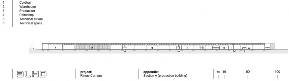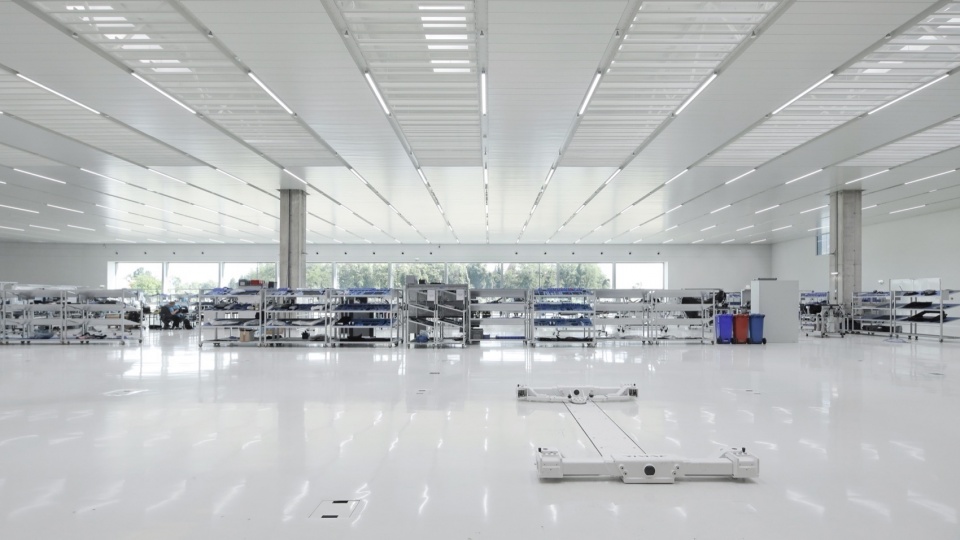 生产设施位于一座超过75,000平方米的封闭建筑内,能够完成从零部件到成品的全过程生产。快速建造得益于工业建筑技术,结合了预制钢筋混凝土和钢结构元素。建筑内部不同的生产环节高度整合,设计上为灵活调整和快速适应提供了空间。各部门被设计为独立的“房中房”结构,拥有六米高的天花板,并设有中间层用于设备安装。除了生产和存储区域外,建筑还包括博物馆和与生产相关的办公区域,这些区域位于通过绿色中庭和天窗采光的夹层中。生产建筑像一座工厂展厅,生产的各个阶段通过玻璃窗展示,成为参观的部分内容。