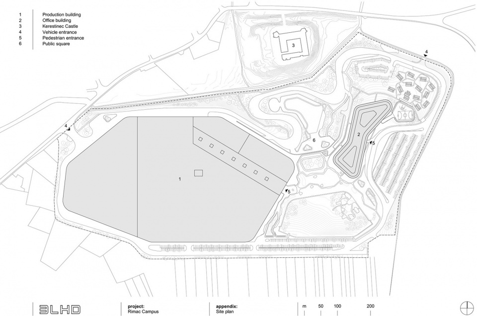 The existing state of the plot gave the impression of a space without notable features, but it contains a varied topography with height differences reaching up to seven meters in some places. The only dominant feature in the area is the historic Erdödy Castle, located nearby. The new campus emerges as a modern interpretation of specific technological functions integrated with the existing elements of the landscape. The construction is planned in phases, which include building the production facility, landscaping, construction of an office building, and employee accommodation units. The campus is defined by two recognizable structures – a glass office building and a large enclosed volume intended for production. These structures are connected by an artificial topography of a green roof, beneath which a restaurant, kindergarten, and employee facilities are located. Along with the construction, another key aspect of the project is landscaping, which includes pathways, a lake, greenery, and a racetrack.
