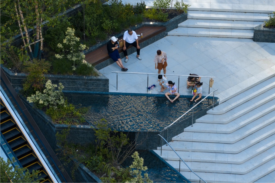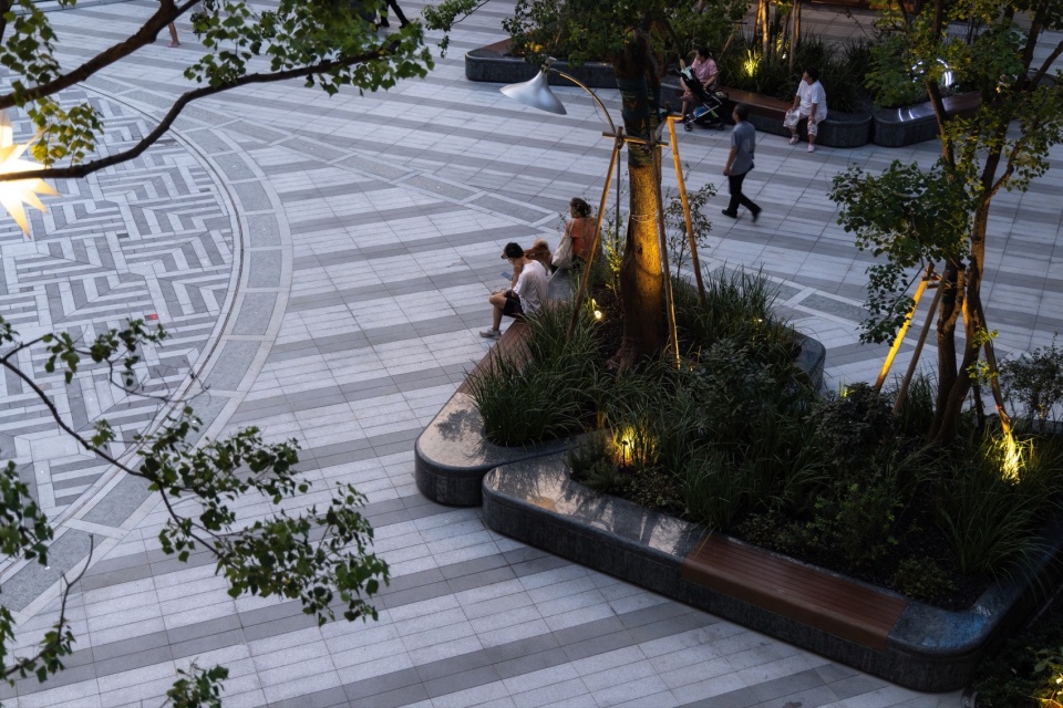 Xuhui Vanke Plaza is a complex community commercial area of approximately 100,000 square meters, which can be directly accessed via the B2 level of the Shanghai South Railway Station metro station. As the final piece of the entire development, it utilizes the site and architectural elevation differences to connect a series of public activity spaces, including the “Youthful Valley” B2 level sunken commercial block, the “Starlight Plaza” B1 level sunken central plaza, the “Chill-Hill Flow” stepped sunken plaza, the “Maple Grove”, the second-floor “Love Hill” terrace garden, and the fifth-floor “Golden Pine Alley” rooftop garden. These spaces offer residents outdoor activities such as art performances, leisure under the trees, children’s play and socializing, fitness and entertainment, and plant viewing.