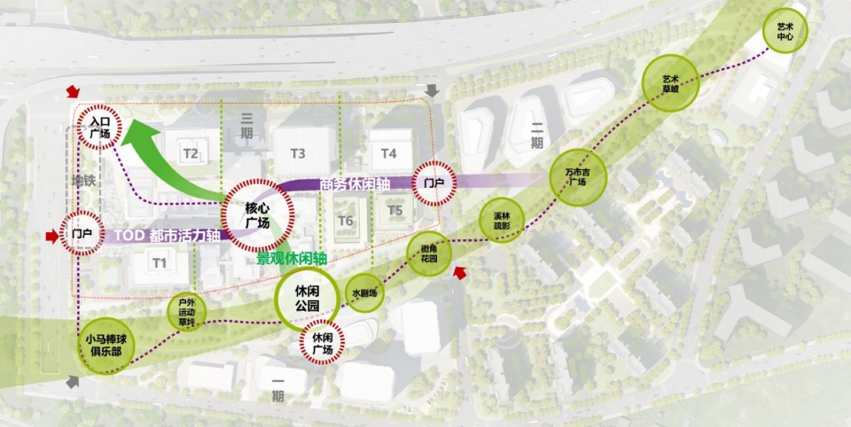 为了解决上述问题,日建设计在规划中通过 “TOD都市活力轴”、“商务休闲轴”以及”景观休闲轴“三条轴线将门户入口、核心广场、一、二、三期的商业、办公、绿轴公园串联起来,使得人流可以通过友好的步行网络和垂直交通,便捷穿行抵达各个功能空间;同时也将公园的绿色斑块延伸到三期不同标高的广场、露台、裙房及塔楼屋顶。