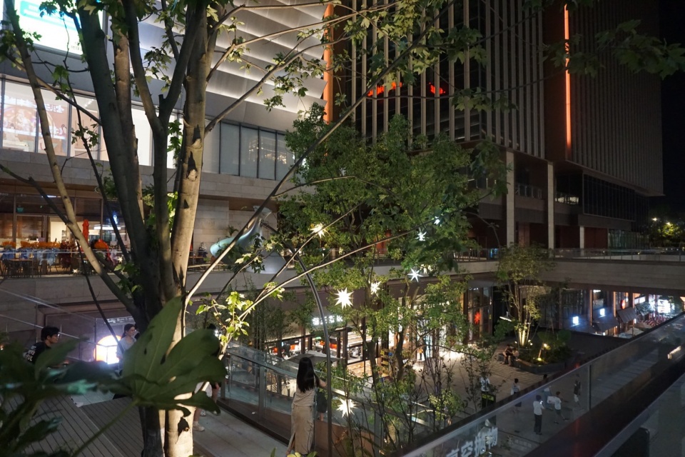 在商业4F-5F露台花园,打造了一处刚柔相济的松林草原。其中的金钱松,作为白垩纪时期残遗的古老物种,目前只在中国长江中下游少数地区幸存下来。秋叶簇生,像一枚枚金黄的铜钱,是珍贵的观赏类植物。