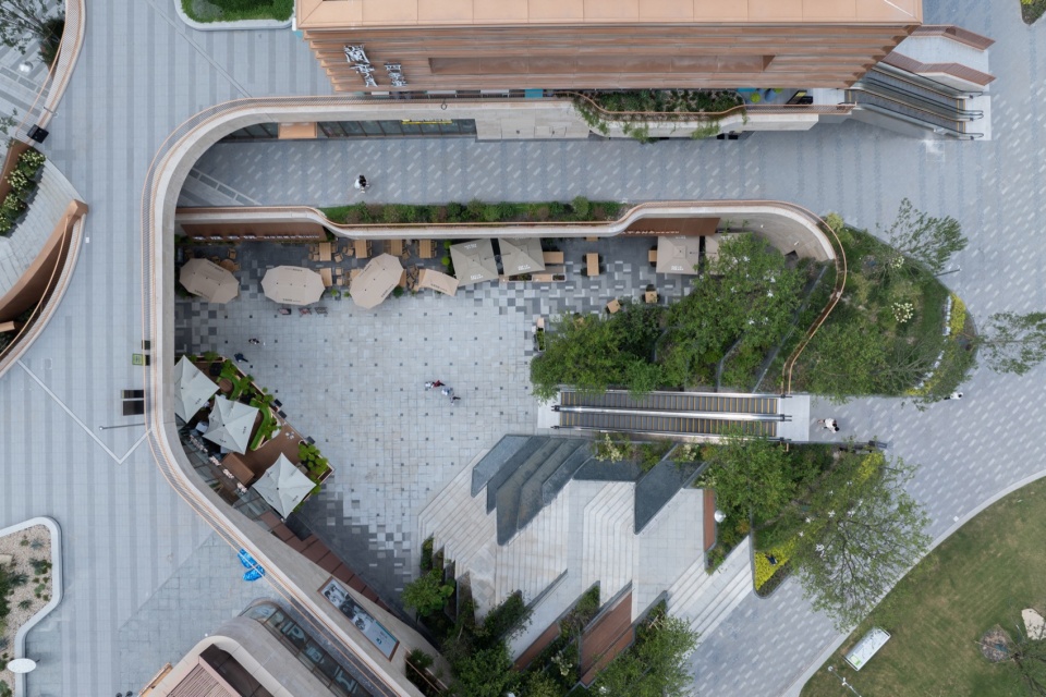 The “Blanket Block” tiered pedestrian system connects at various elevations such as -5.1m, -1.2m, 5.3m, 10.23m, 16.68m, and 22.4m, linking various urban interfaces and drop-off areas on the ground level, as well as the western subway entrances. It also connects the park to the south with the functional groups of the second phase. While efficiently shuttling between different functional groups, it forms a three-dimensional and richly landscaped public space with the characteristics of a hilly terrace.