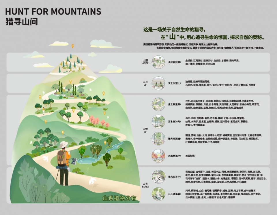 由于整个场地从商业办公到公园存在多种跨标高,特别是商业办公建筑部分复杂的多层结构高差与荷载限制,无法种植大量乔木作为“山林”的传统印象特征。因此,为了实现徐汇“山林中城”,我们联合万科业主、无尽夏花境、大小景观、季相景观,提出“生态圈分层”和“杂木林”作为植物群落共生的两大策略。提升了商业街区内有限绿地渗透的舒适度,在地铁轨交上盖的西侧段绿地公园,提高公园的生态承载力,并且丰富了徐汇区的植物多样性。