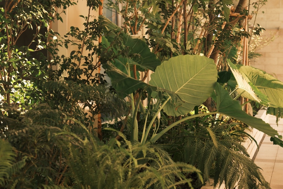 The Youthful Valley is located between the towering B1 and B2 buildings, thus it uses natural, slender, and transparent canopy trees as its framework to mitigate the oppressive feeling brought by the buildings; the flower borders at the bottom level are chosen with spacious, broad-leaved plants that naturally overflow from the tree pool seating.