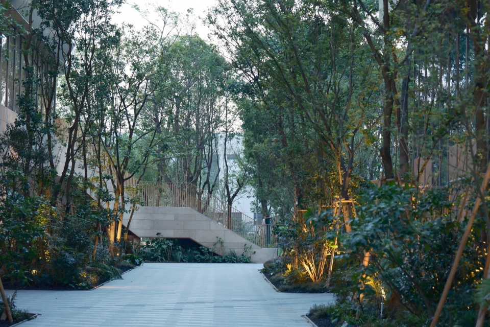 “自然共生 ”即“山林中城The Center City Hill”。徐汇区具有良好的城市绿化系统,从东南侧的上海植物园至上海南站站前的大片公共绿地,再到各街坊内部的公园、绿地斑块。徐汇万科中心也是整个徐汇城市绿轴的重要节点。在原有东侧中城绿谷基础上,在西侧公园进行迭代更新,形成“Park公园 x TOD”的“POD”现代公园中的城市模型,在后续的景观设计和落地过程中,我们通过“生态圈分层”和“杂木林”两大策略,将绿色生境延续到三期“村落建筑The Village”不同体量与标高的肌理之中,再造一个自然、低维护、可持续的“适地山林”。