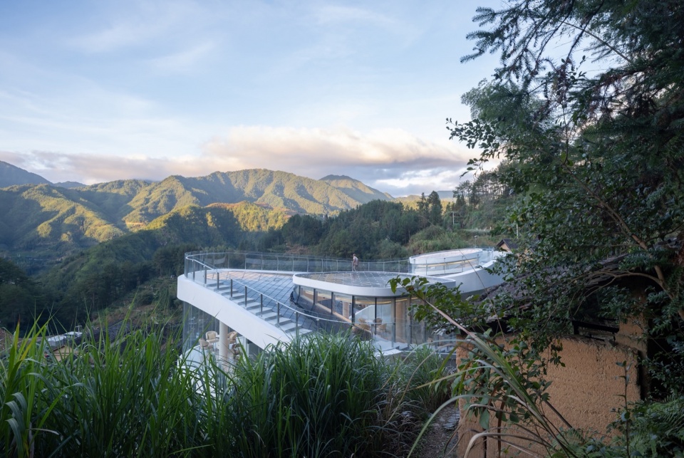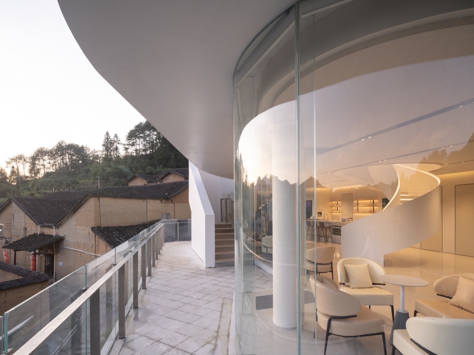 The two-story structure comprises a tea bar, tea culture exchange area, and a scenic leisure space, each offering spectacular views. The elegant curves run through the entire space, seamlessly integrating the architecture with the interior design and ensuring the unity of the overall concept. The panoramic glass walls allow villagers and visitors to view each other, forming a mutual appreciation.