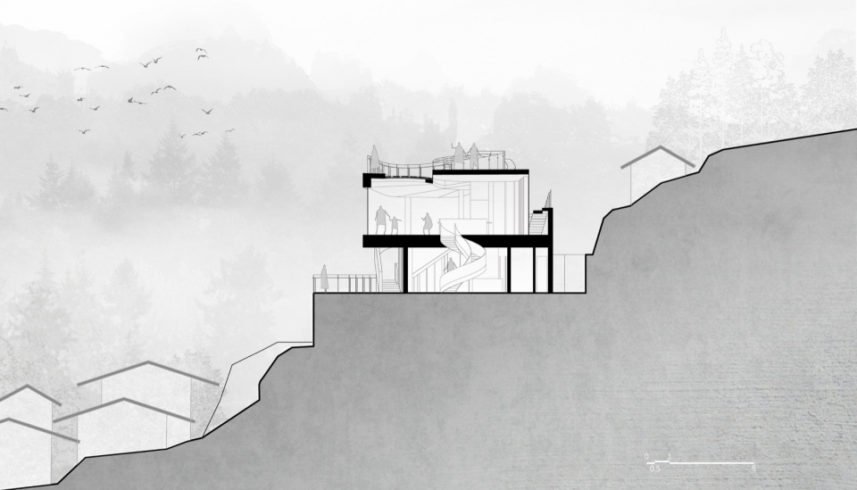 不同于惯常的乡村建设方式,HATCH 构建的零碳茶馆在材料、配色、质地和形态上与周边村落形成了极大的反差。然而,当人们顺着盘桓的山路缓缓步入建筑内部,再沿着螺旋向上的行走动线抵达屋顶时,却会感受到一种令人赞叹的和谐之美。