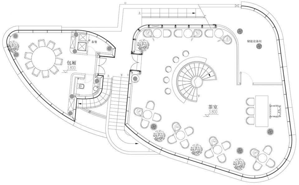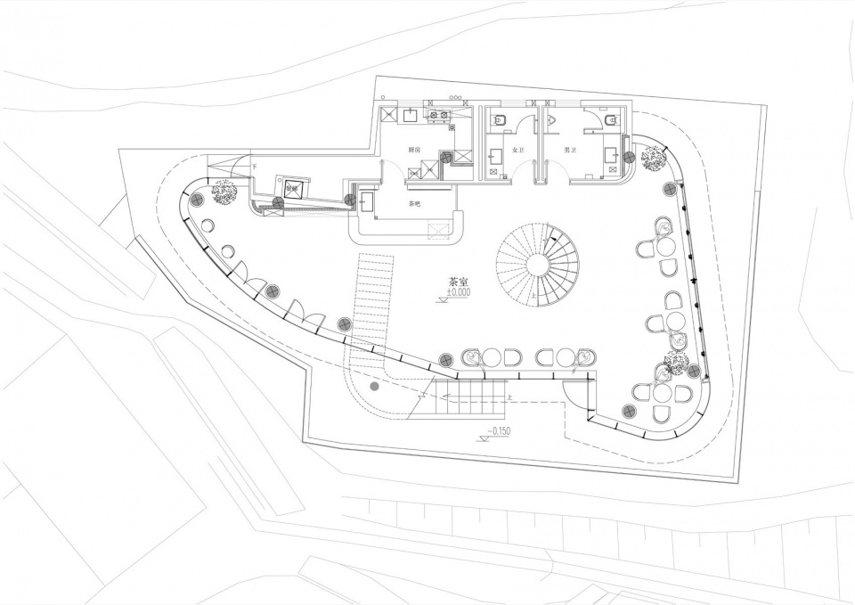 茶馆分为上下两层,设有茶饮区、茶艺交流区和观景休闲区,每一处皆拥有绝佳的视野。优雅的弧线贯穿整个空间,使建筑与室内设计完美融合,确保了整体设计的统一性。透过全景落地玻璃,村民与游客彼此欣赏,互为风景。