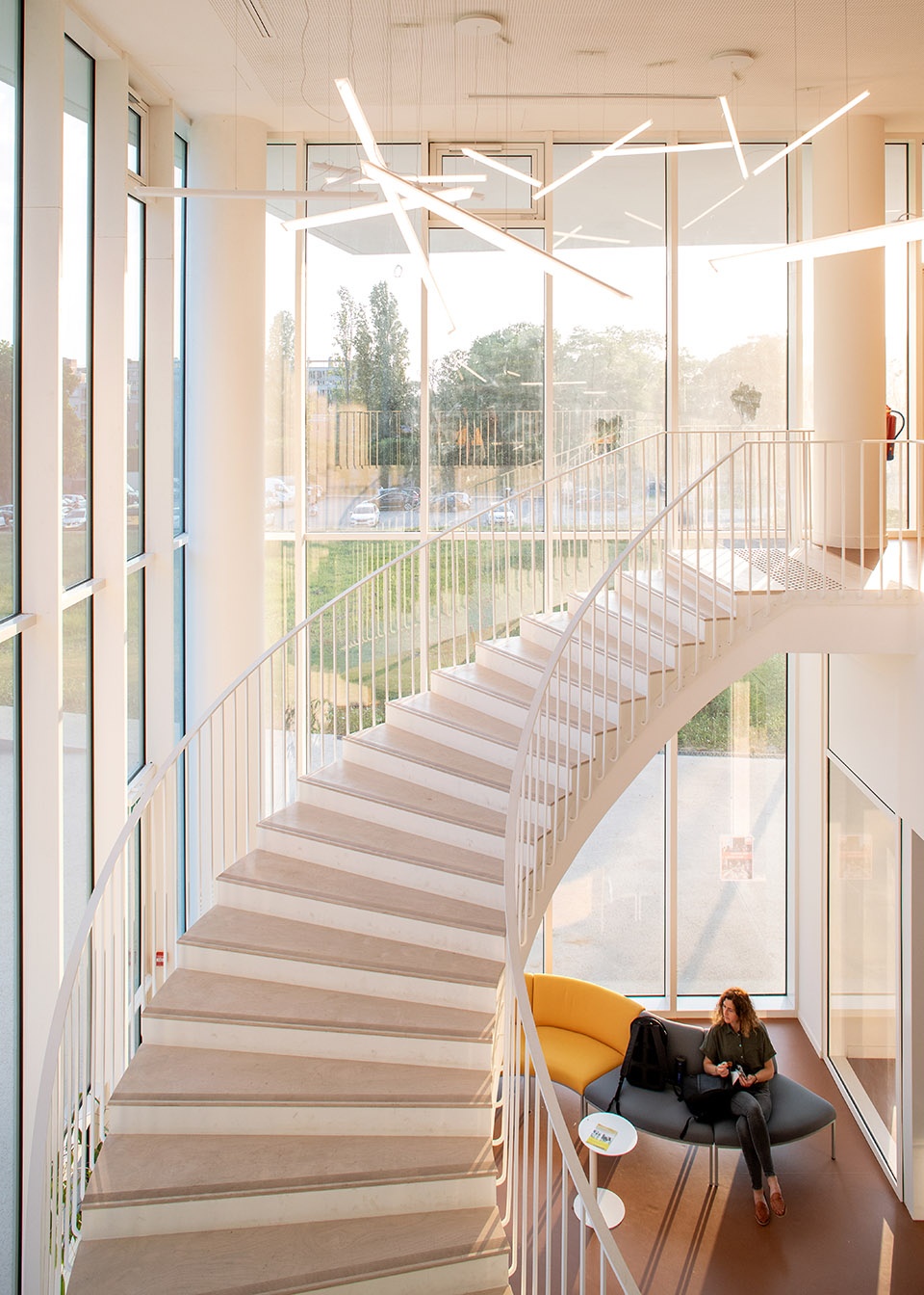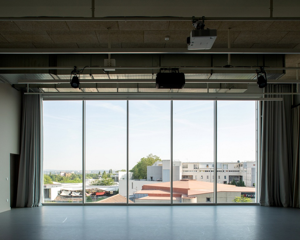 Erected over 4 levels, the glass, concrete and Corian building is composed of strata that rotate one on top of the other, like a set of balanced volumes. A public volume (ground floor and first floor), articulated around the auditorium, opens onto an esplanade and the lawn through large glass sequences. Above, a more intimate volume (R+2 and 3), devoted to practices, is organized around the central patio.