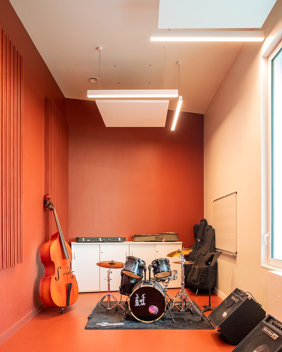 The program is based on a bipartite combination. The ground floor and first floor are arranged around the auditorium. Levels 2 and 3, dedicated to practice spaces, radiate out from a glazed patio.