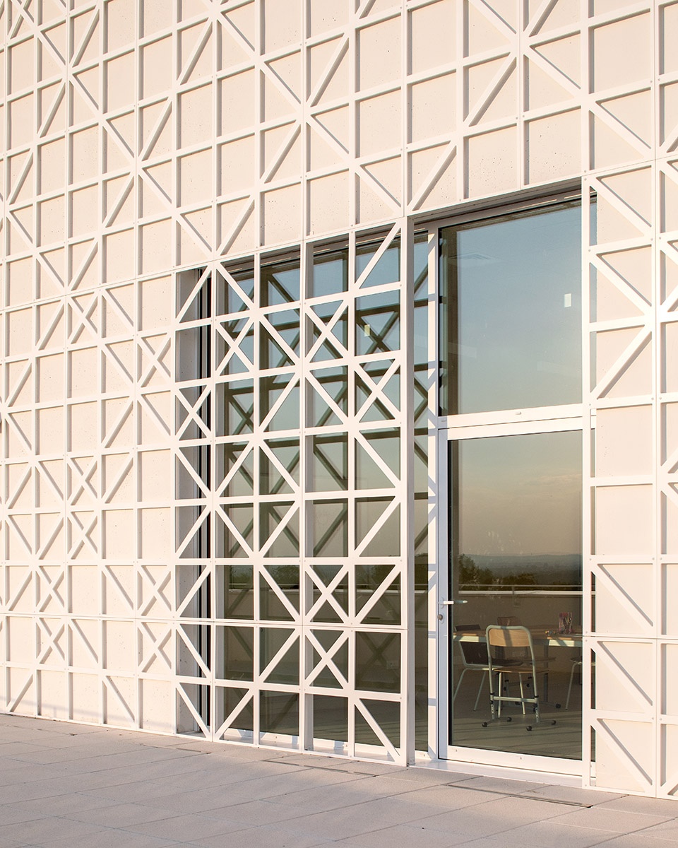 The monolithic white concrete ensemble is enhanced not only by the movements infused into the volume, but also by the way the motif glides over it. Part cladding, part sunshade, this cladding gives depth to the façade, which comes to life as the hours of the day and the light change. A play of shadows and reflections is created.