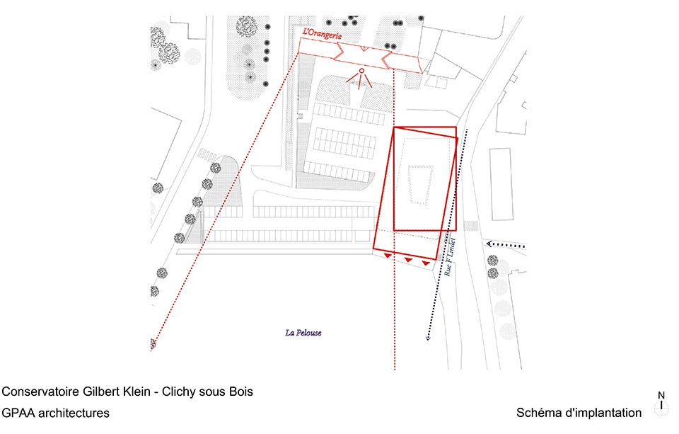 新音乐学院位于克利希-苏布瓦上下城区的交汇点,是一座真正的十字路口:建筑坐落于草坪和18世纪的橘园之间,沿着悬挂的费尔南·林代大道。第一层遵循大道的轴线,而上层与橘园对齐,创造出一种视野效果,并且有一个外部公共楼梯通往下方的广场。设计的挑战在于如何将建筑物在这两个平面之间进行协调。通过连接上层和下层的方式,建筑形成了动感的韵律。音乐学院的基座与其周围的区域紧密相连,呈现出人性化的尺度。它拔地而起,标志着这座城市的新印记,深深扎根于其所在地。