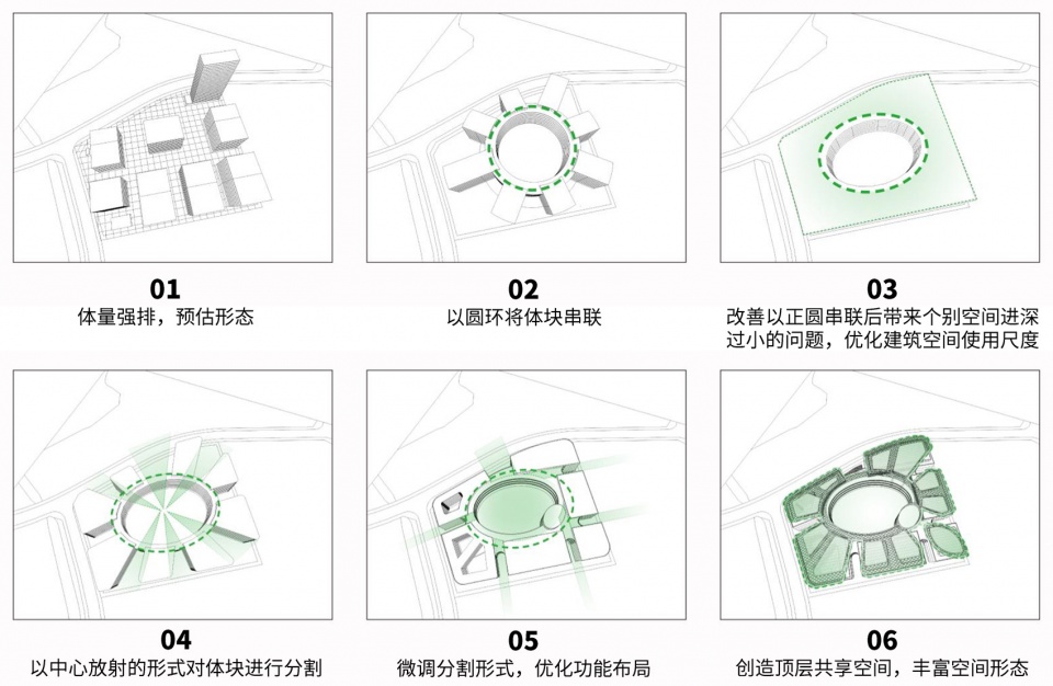 在满足工艺要求的同时,中研星园从低碳策略、功能复合、可持续发展上探索。五个巨型体量在释放大量内部景观的同时,创造了与环境的生态资源相呼应的可能性,这是基于城市尺度下绿色能源和人体舒适性双向发展的可续工厂概念。